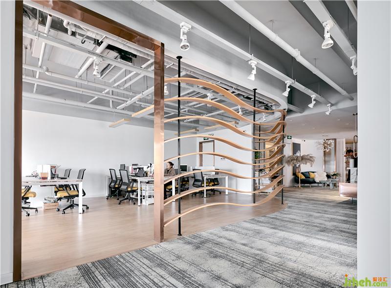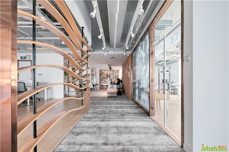 過(guò)道走廊作為公共空間的人流動(dòng)線域,直接體現(xiàn)空間的整體品質(zhì),打破了封閉空間的束縛,利用半透明間斷弧形屏風(fēng)隔斷營(yíng)造出虛實(shí)相生的效果,另一側(cè)的藝術(shù)毛羽飄落傳遞出飄逸輕盈充滿時(shí)尚,獨(dú)具浪漫特性。辦公室設(shè)計(jì)