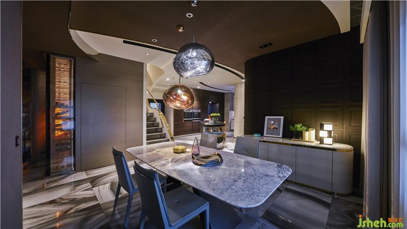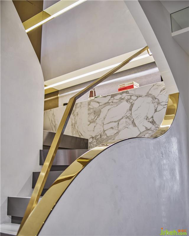一樓以弧形線條貫穿整體空間,利用較濃郁的色調(diào)營造出50、60年代的歷史氛圍??蛷d以深色作為主色調(diào)呈現(xiàn)歷史感,餐廳則使用較簡單的材料,讓空間的律動產(chǎn)生不同的變化?;【€從客廳、餐廳一直延伸到廚房,營造出巧妙又和諧的互動關(guān)系;膠囊外型的中島吧臺亦呼應(yīng)著圓弧的延伸,以鍍鈦鋼板包覆于外層,不僅塑造出輕盈感受,更能透過其反射效果讓空間貫穿著延續(xù)性。樓梯以金屬與白色大理石等材質(zhì)作為延伸空間的媒介,柔和弧面漸次拉展為折線,預(yù)告著空間風(fēng)格的轉(zhuǎn)變。