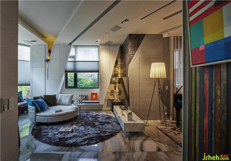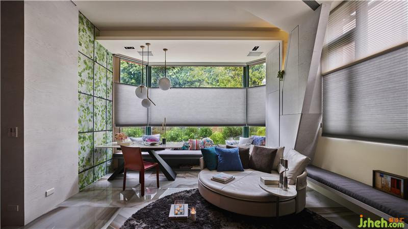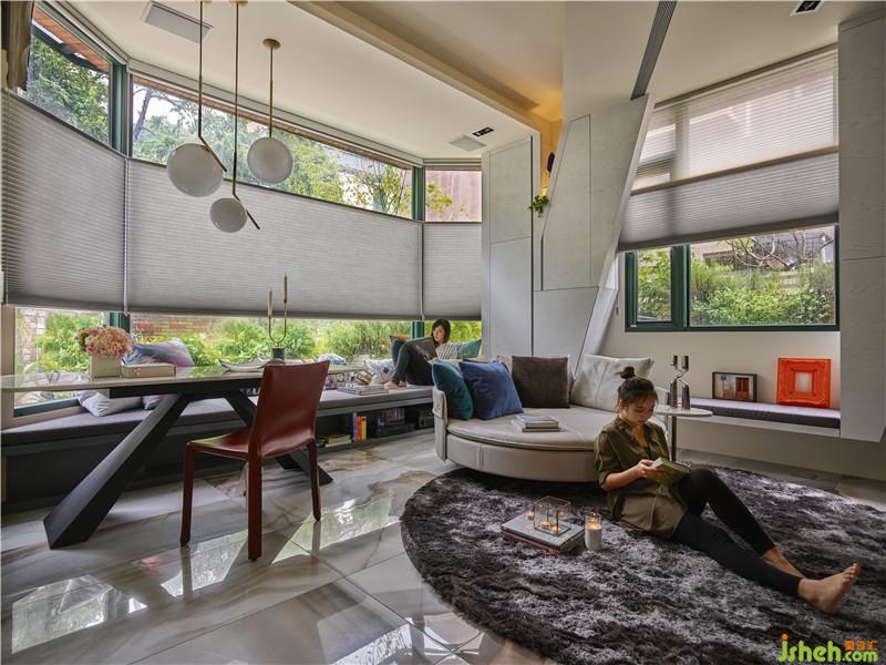 在小坪數(shù)的空間置入鋼琴,將它視為公共空間的主體,作為串連客餐廳與廚房的角色,進(jìn)而達(dá)到場域的開放流動(dòng)性;針對客廳部分,打破舊有常規(guī),以彈性的座椅模式呈現(xiàn),與窗外造景互相對話,引景入內(nèi),讓綠意在室內(nèi)游走;將餐桌移至窗邊,形塑一種在田園用餐的愜意氛圍,也圍塑出客餐廳的共享感,藉此加大活動(dòng)范圍的錯(cuò)覺。天花板的延續(xù)及燈光配置看似只是造型的一環(huán),但整個(gè)空間其實(shí)有著強(qiáng)大的收納功能,將興趣與生活做完美連結(jié)。