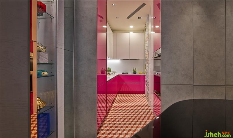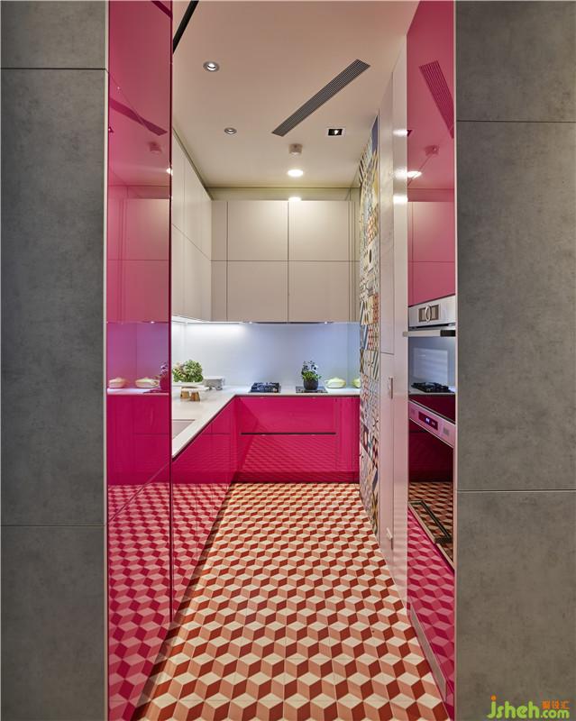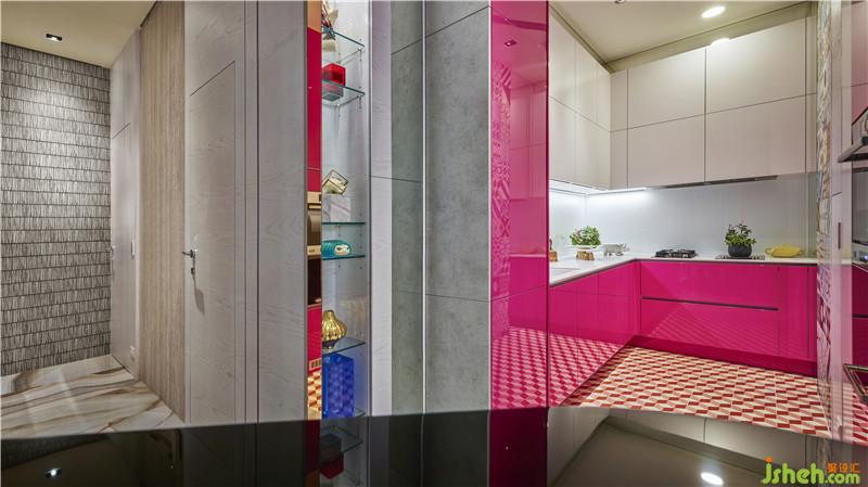 色彩搭配上以大地綠色調(diào)作為基底,再層層堆棧豐富色彩,創(chuàng)造獨(dú)特且具有內(nèi)涵的空間層次。廚房則選用女人對料理熱情的桃紅色,顏色飽滿,平衡了兩側(cè)水泥柜體的原始質(zhì)感,彷彿是在一片灰色之中拉開繽紛世界的入口般絢爛,十分具有藝術(shù)張力。而主臥講求穿透調(diào)性,已大量弧形圍壁營造包圍意象,用紅色的熱情灰色的沉穩(wěn)述說的一抹法式復(fù)古懷舊感,色彩及造型的深厚底蘊(yùn)設(shè)計(jì),交織出了令人驚艷的小宅佳作。
