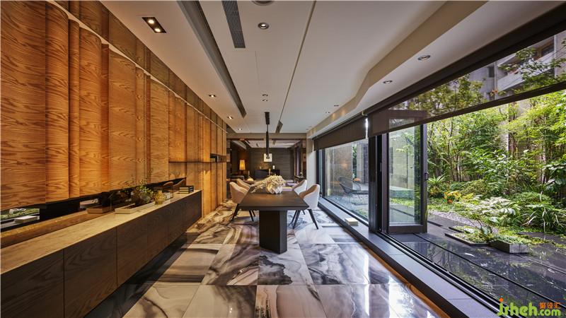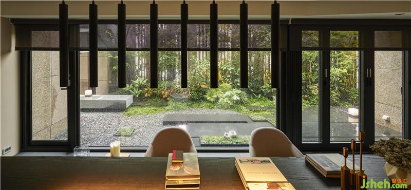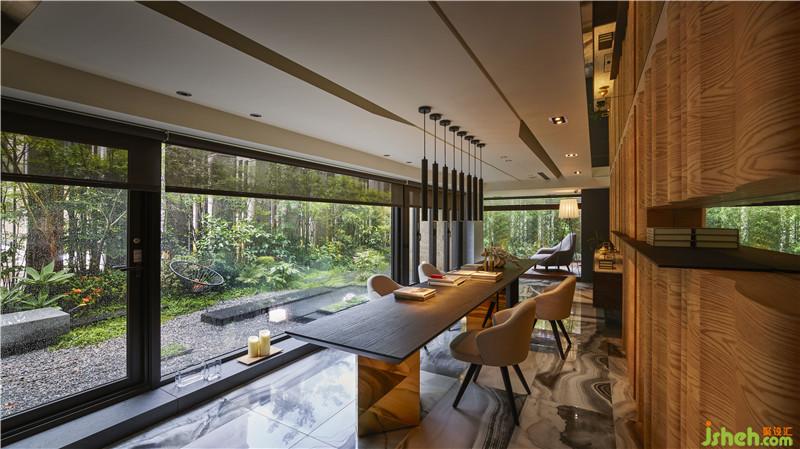 多功能會議廳采用大面開窗與摺窗的設(shè)計,使外在景觀滲透室內(nèi),打造一個室外零界線空間,彼此呼應(yīng),讓住戶能輕松自在地沉浸于自然景觀、享受陽光的沐浴;室內(nèi)空間利用概念性景觀的設(shè)計與室外做呼應(yīng),于墻面注入了古典語匯的弧線線條,淡淡地散發(fā)奢華之感;家具、燈飾的材質(zhì)上用了很多不同手法,讓自然與奢華能夠表現(xiàn)性的融合新生。