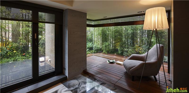 移步異景,隨著陽光灑落的光影,來到由無框式大面玻璃呈現(xiàn)的竹林端景,透過三個空間層層交疊,層次間襯托出竹林的種種風情,從遠觀到身臨其境都有不同的感受,在此空間閱讀,更彷彿置身于竹林一般悠然、愜意。