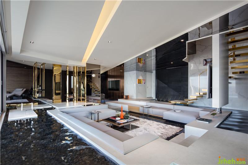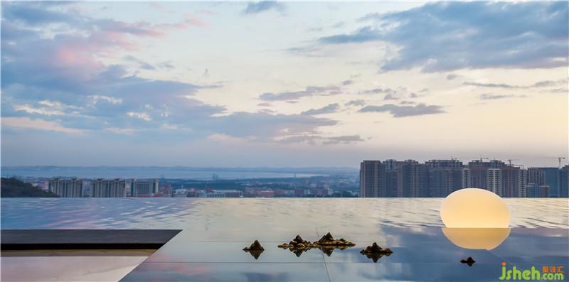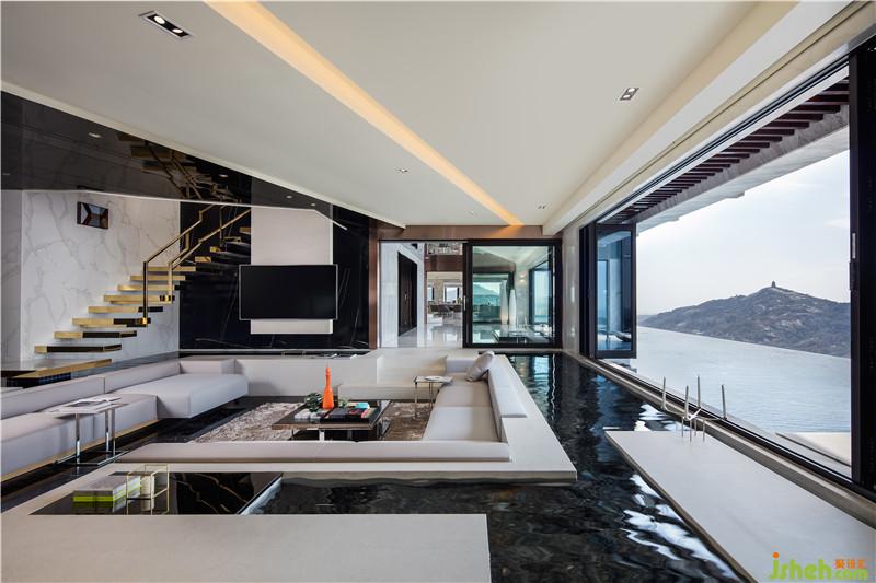 建筑室內(nèi)外空間的界限在此打破與模糊,塑造無邊際泳池和下沉式客廳休息區(qū),延續(xù)天際線的線條,讓水系光景無限滲透至室內(nèi)空間,延伸至客廳汀步,水暈與光影的交錯律動下,仿若置身于云海間,愜意而宛然天成。