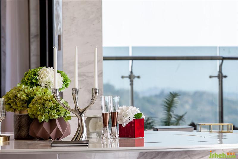 移步至餐廳空間,干凈流暢的線條在自然肌理鋪陳下,投射以浮云和天空的柔美情韻,虛實間勾勒出瑰麗與靈動,潤澤身心的精神界池。在純凈簡白的色彩基調(diào)下置入當(dāng)代低調(diào)奢華的家具陳設(shè),大理石金屬等不同材質(zhì)的通透質(zhì)感和粗曠肌理,鍛造錯落有致的視覺層次和質(zhì)量感。