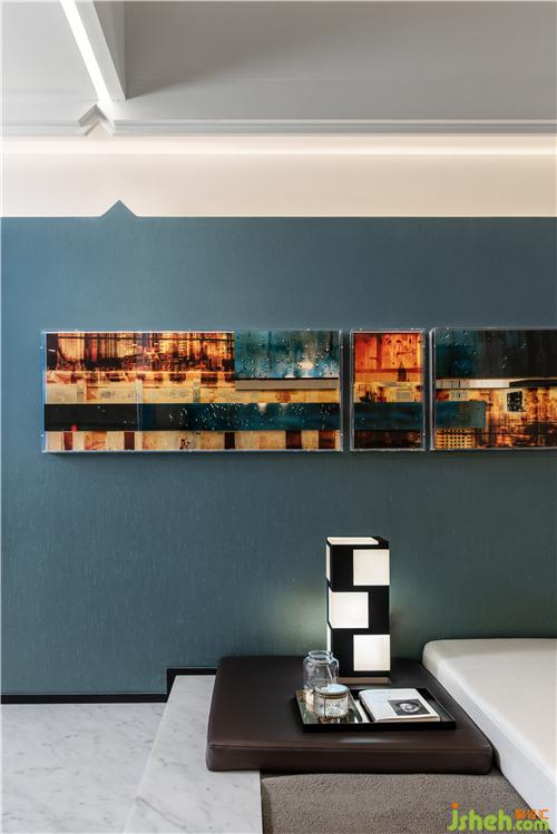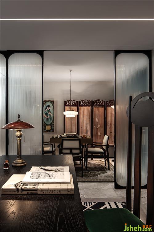 盛行于民國時期的水紋玻璃,如流動的水瀑般傾瀉而下,炙白與冰藍(lán)交互,淡粉與淺綠言和,如閃爍于舊上海的霓虹,將繁華記憶凝固于此,為整體空間營造朦朧清透的美感。虛無的白,湛澈的海,空間的界限被消解,現(xiàn)實(shí)世界與夢幻空間漸次模糊。