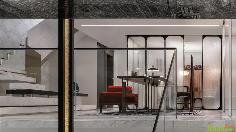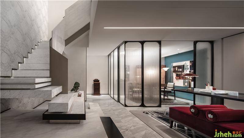 簡潔抽象的集合體組合成舒展有序、起伏變化的形體。穿越至民國往日那些錯錯落落的屋檐、窗欞之中,每一步皆在歲月中行走。頗具藝術(shù)感的的旋感樓梯作為媒介,以豐富的角色、精彩的形式和精湛的工藝,傳遞出民國風(fēng)最典型、最深層的標(biāo)簽和精神??臻g層次錯落,猶如微縮的Art Deco摩天建筑群。與彩色鐵藝玻璃屏風(fēng)、白色石材馬賽克地板,以及臺階內(nèi)嵌的黃銅,共同形成一種優(yōu)雅又傲慢的氣氛。