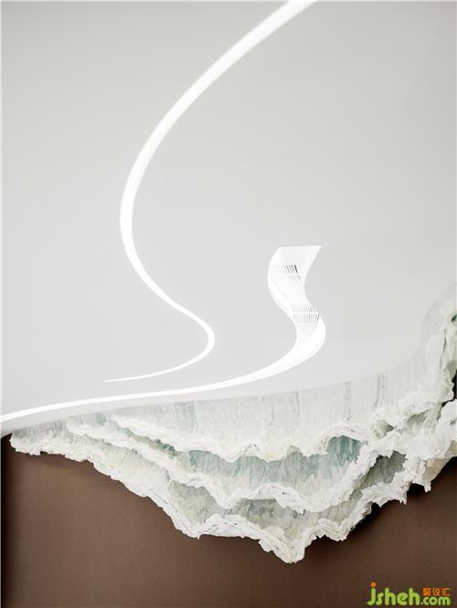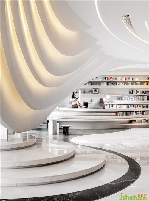 書吧區(qū)靜處一隅,勾畫出一個(gè)好似《冰河世紀(jì)》般巨大的冰川溶洞中新生的文明世界,又如《侏羅紀(jì)公園》模擬而成的遠(yuǎn)古地殼運(yùn)動(dòng)誕生物,宏大而遙遠(yuǎn)。沿墻體一側(cè)自然剖開的流體空間,將每本關(guān)于文明的記載一一陳列期間,強(qiáng)化空間的虛實(shí)關(guān)系,似有似無間延伸空間縱深感。
