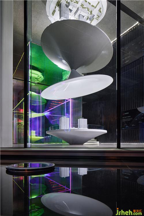 陀螺旋轉、光的遷徙,引導著觀者潛意識的流動,實現(xiàn)對多層空間的搭建。從入口行經沙盤,從一樓會客區(qū)再到二樓會客區(qū),時空折疊下的極致魅力,杭州售樓處設計令每一寸空間皆成為奇特想象與現(xiàn)實空間的完美融合,引導參觀者一步步踏跡武林之芯的盜夢空間。