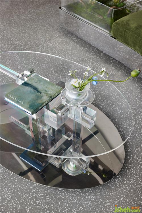 橄欖綠絨面會客沙發(fā),色調輕翠空靈,凝練一出遐思悵惘的城市夢境。質感高級的長條選型,延伸了空間視覺感官。細膩的陳設與色彩在洗練的體塊中游走,抒簡流暢的弧線,呼應頂視面盤旋的環(huán)形陀螺裝置。