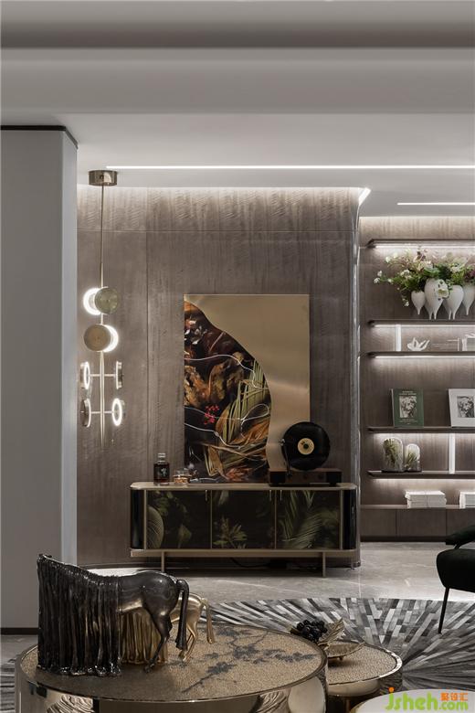 玄關(guān)簡(jiǎn)明而逸靜,細(xì)節(jié)陳設(shè)在動(dòng)靜之間尋找縱向的空間平衡,樣板房設(shè)計(jì)以流動(dòng)姿態(tài)喚起生活共感。