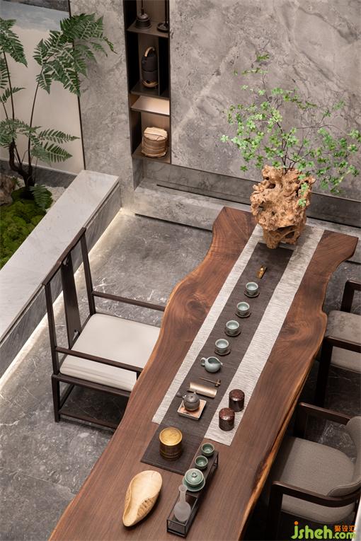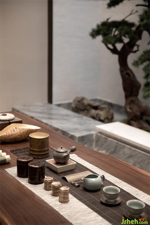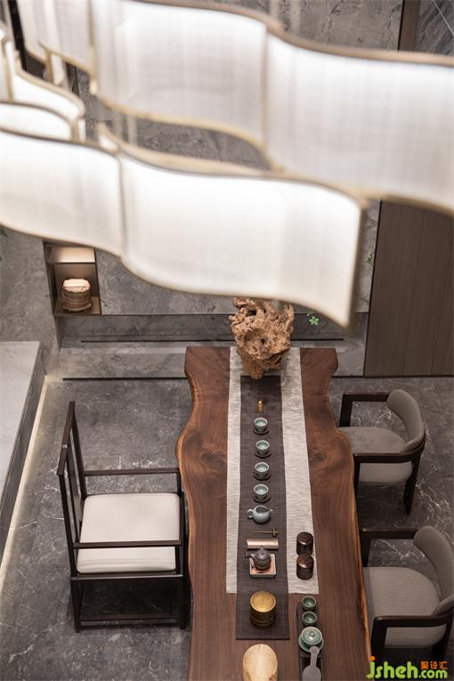 愈發(fā)鐘愛青石板,席水而坐,閑適成詩,奏響院中的隱逸序曲。木色與巖板的材質顏色使空間色彩與材料質感的相融合,樣板房設計營造了一個低調優(yōu)雅的生活居所,濃淡有致,勾勒出空間的張力和層次。