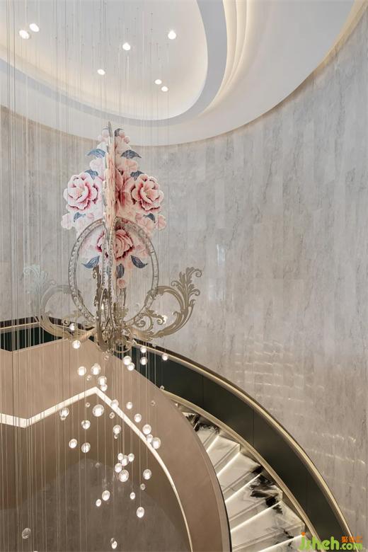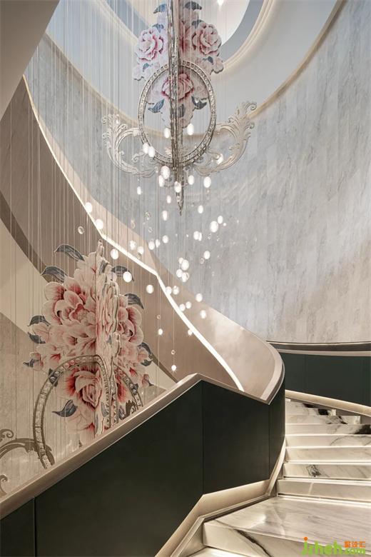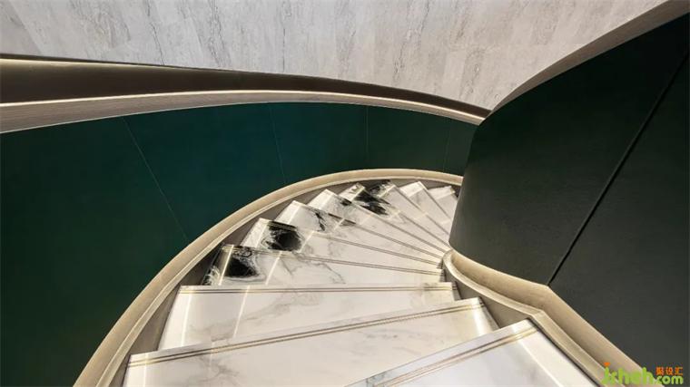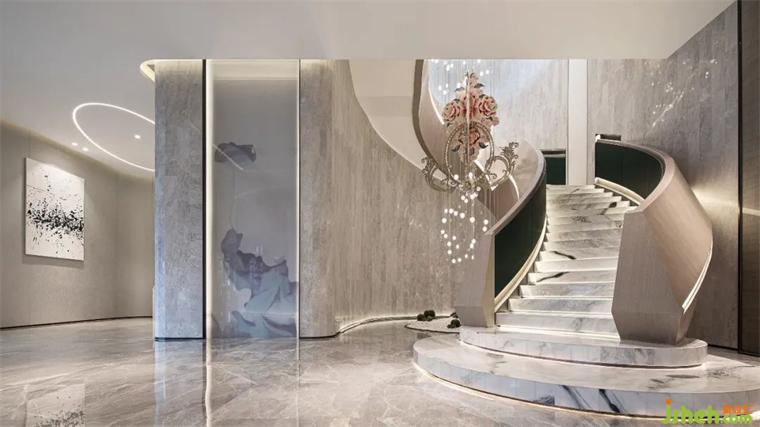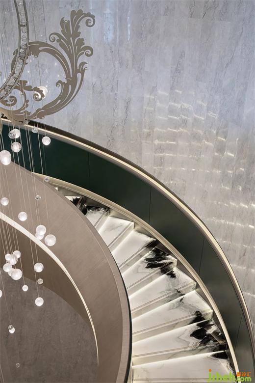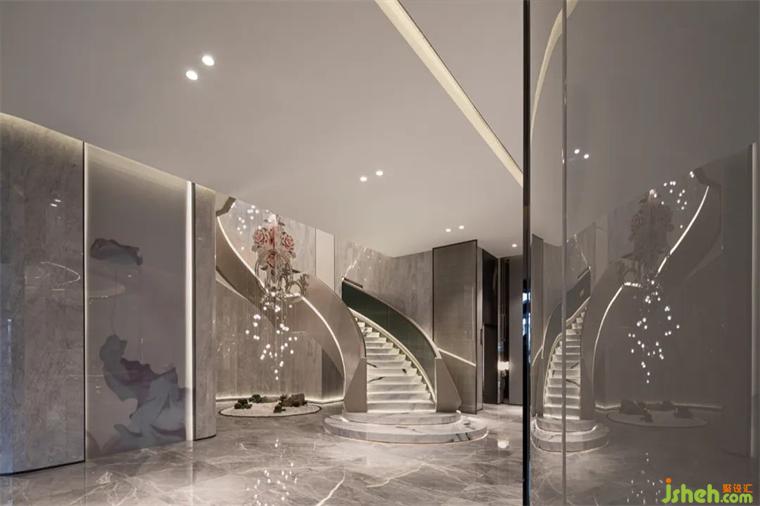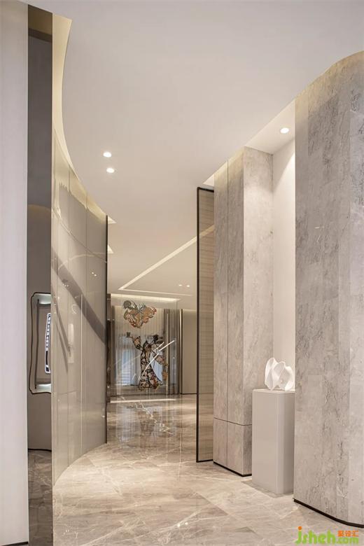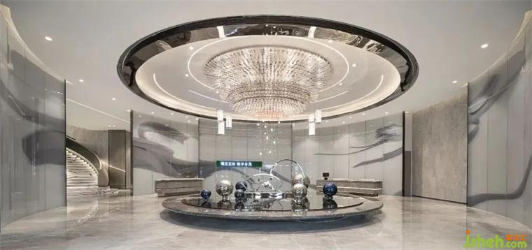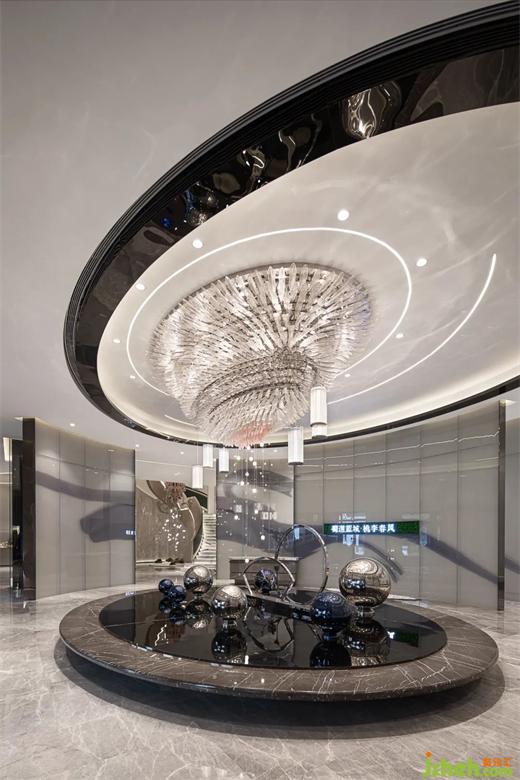大堂接待廳采用開敞式空間,空間上用幾塊半弧來作為隔斷把功能區(qū)劃分開,售樓處設計在材質上采用當?shù)厮囆g文化川劇掃尾的形式作為夾絹玻璃的表現(xiàn)形式,再加上鏡面不銹鋼的點綴,自入序廳,步移景異,空間不斷變化,生活的價值感隨之不斷迭新。