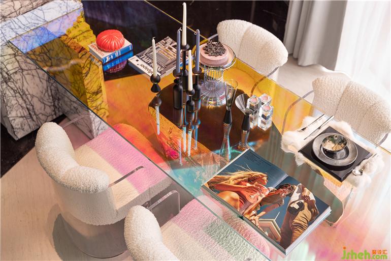 溫暖毛絨和透明質(zhì)感亞克力組成藝術(shù)單椅,流光溢彩的琉璃餐桌懸浮在冰川之上,在這個(gè)神秘和探索的空間,就算一日三餐,也極盡夢(mèng)幻浪漫。