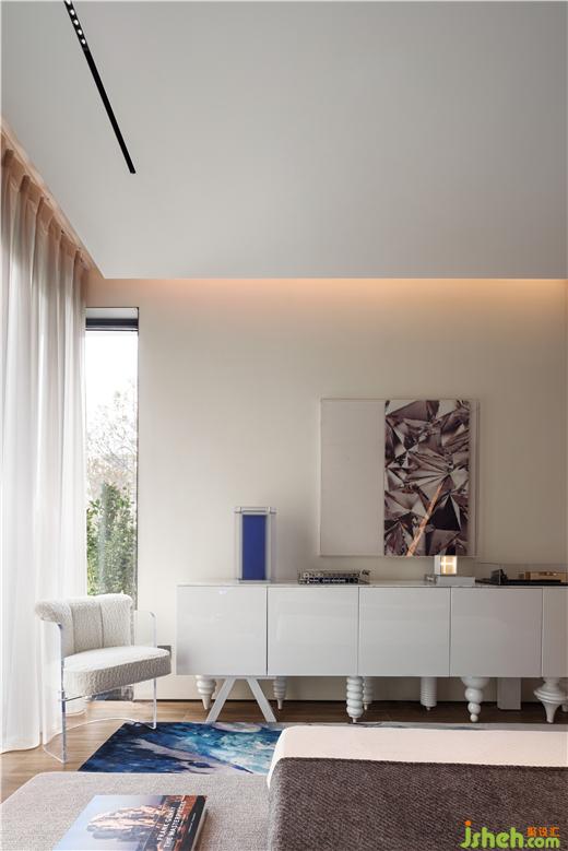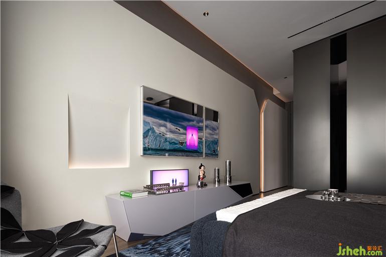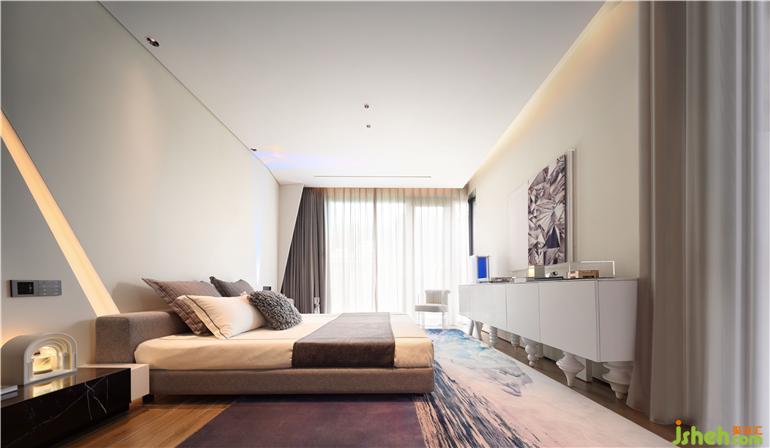 床頭背景墻一道淺色人造石,點(diǎn)綴線條燈,凌厲線條帶來(lái)切割的破碎美感。秦皇島樣板房設(shè)計(jì)漸變的極光裝置、歷經(jīng)億萬(wàn)年的藍(lán)冰川地毯、璀璨冰層切割面裝置畫……雖然春天已來(lái),卻還是有冰雪仍未完全消融。