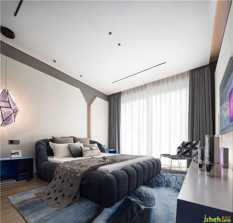 靜怡悠遠(yuǎn)的臥室空間,正是“靈動(dòng)”意境無(wú)盡的審美韻致的呈現(xiàn),亦是精神與存在的合一。秦皇島樣板房設(shè)計(jì)靜謐黑、極晝白和克制藍(lán)是空間主色調(diào),淺色與深色交替出現(xiàn),形成視覺(jué)張力。空間中運(yùn)用了大量的留白和不對(duì)稱的布局方式,而整個(gè)畫面依然顯得和諧平衡。