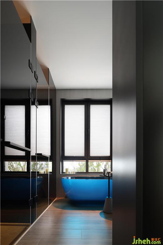 主衛(wèi)延續(xù)主臥的藍(lán)色,是更加濃郁純凈的克萊因藍(lán),藍(lán)色透明、線條圓潤(rùn)的潔具,秦皇島樣板房設(shè)計(jì)像是撲面而來的天空和海洋,是格外強(qiáng)烈的視感沖擊,明凈空曠使人迷失其中。