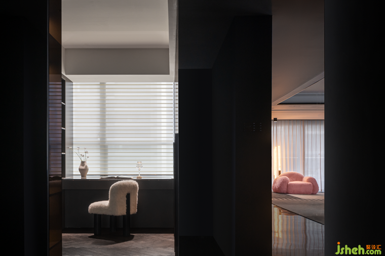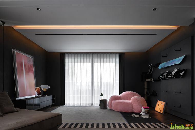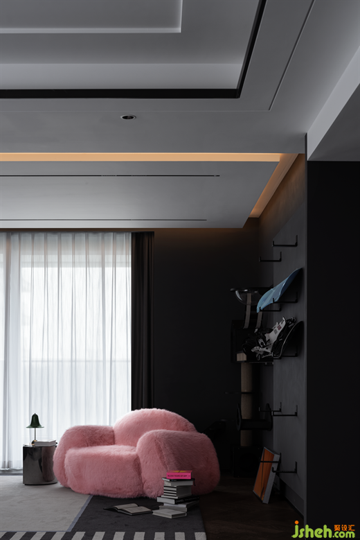 粉紅軟糯的毛毛沙發(fā),是這個灰色空間里一道溫柔明亮的光,柔軟舒適的坐感,與空間形成反差,增添空間透氣感的同時,也充滿了滿滿的少女心。