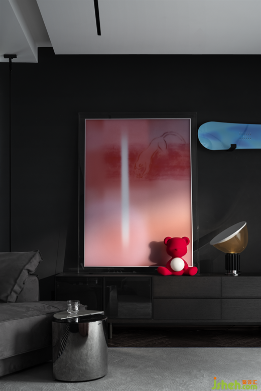 全屋都是暗色最大的弊端就是沉悶無趣,因此設計師通過多種材質、肌理的碰撞,金屬、皮革、玻璃、布藝……讓黑色表達的更有意味。