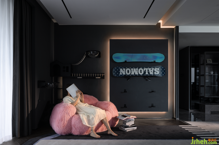重要的是,設計師還巧妙地為這位熱愛滑雪的女冒險家,豪宅設計了一面滑雪板展示墻,用來展示她從世界各地搜集來的滑雪板們。展示墻旁邊的貓爬架,為貓貓狗狗提供了一個玩耍和休息的天堂。展示墻和貓爬架不僅實用,更與整個空間的現(xiàn)代風格相得益彰,展示了Mia對生活的熱愛和對品質的追求。