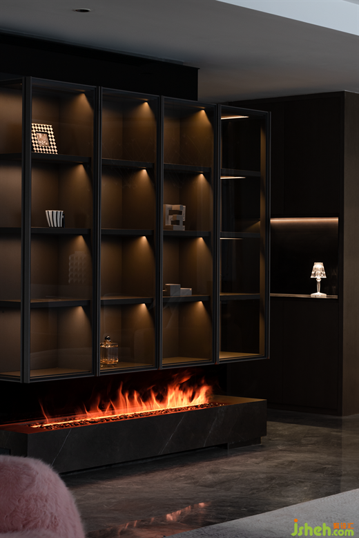 火焰的明亮與周圍的深色調形成了鮮明的對比,更加突出了壁爐的存在感。