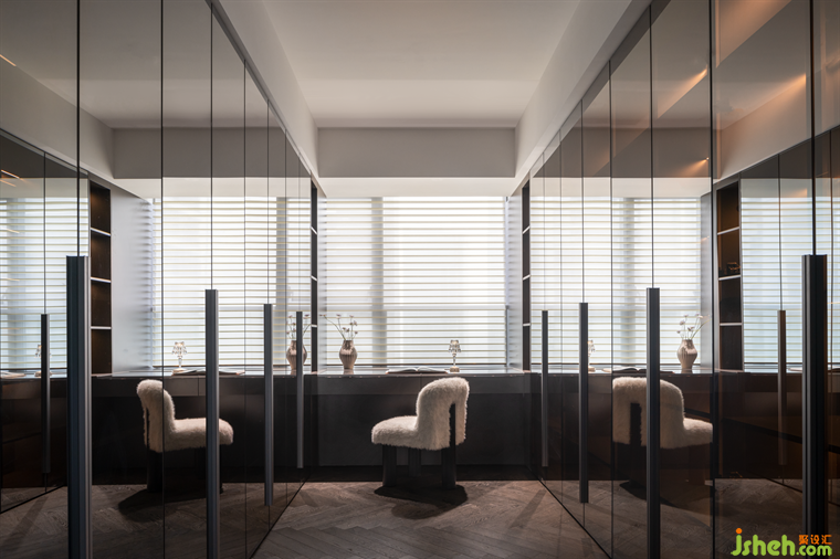 半透黑玻材質打造的衣帽間,大氣又時尚,仿佛一座充滿現(xiàn)代氣息的玻璃宮殿。寬敞明亮的化妝臺正對窗戶,窗外的景色與室內的黑玻相映成趣,營造出一種既私密又通透的舒適氛圍,也完美詮釋了年輕業(yè)主的獨特品味與對生活的熱愛。