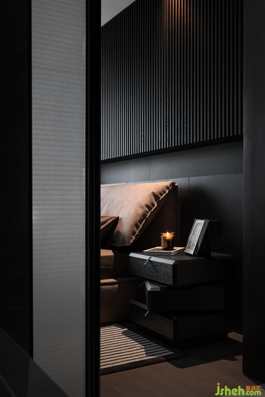 豪宅設計主臥將黑灰色貫穿到底,甚至床品和地毯也堅持選擇了深色,卻意外帶來靜謐感,讓人進入空間不自覺安靜下來,更好地進入休息狀態(tài)。