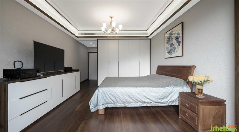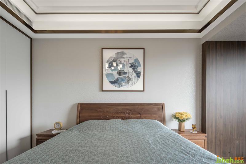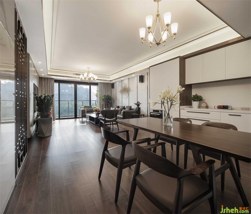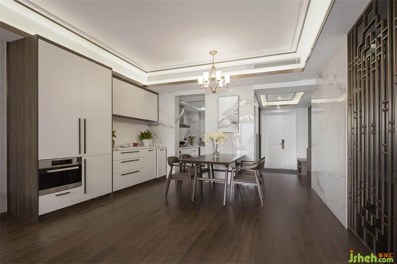 從立面裝飾上,選用胡桃木為主色調(diào),統(tǒng)一柜面、門板及地腳線顏色,運(yùn)用簡練的中式元素家具,以及屏風(fēng)點(diǎn)綴,現(xiàn)代中式場景躍然紙上。