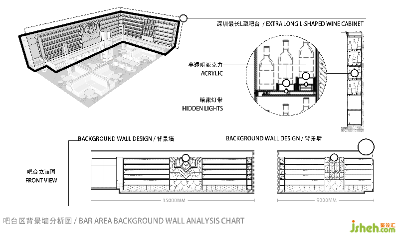 良好的消費(fèi)體驗(yàn),是酒吧商業(yè)的靈魂。項(xiàng)目打造了全深圳最長(zhǎng)的L型吧臺(tái),在彰顯個(gè)性的同時(shí),也奠定了酒吧的基調(diào)。酒柜中階梯式的展示設(shè)計(jì),在燈光的輔助下,讓每一瓶酒都能得到完美的呈現(xiàn)。為實(shí)現(xiàn)更好的消費(fèi)體驗(yàn),設(shè)計(jì)中將吧臺(tái)內(nèi)部區(qū)域做下沉處理,使吧臺(tái)內(nèi)外形成高度差。在彰顯客人的尊貴地位的同時(shí),也在調(diào)酒師與消費(fèi)者之間形成一個(gè)良好的視線關(guān)系。