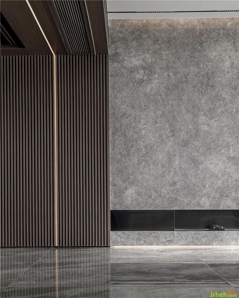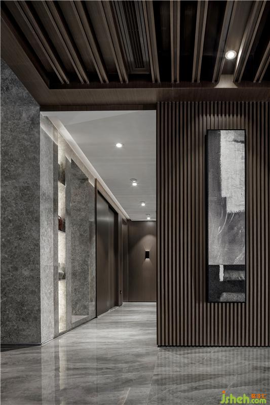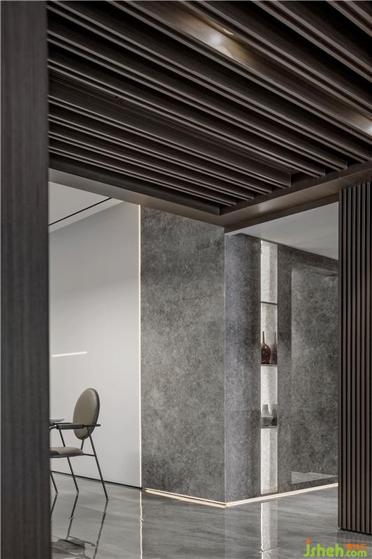 過道設計利用木的切割、線條燈的設計讓客廳和餐廳做了一個合理的分割,充滿現代感和穿越感,里應外合,營造出線條的美感;營造出來的空間序列,視線的通透、封閉、半通透也在這個過程中被精心的安排;進入這里,會有不同的空間感受。