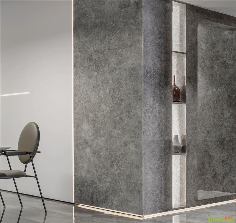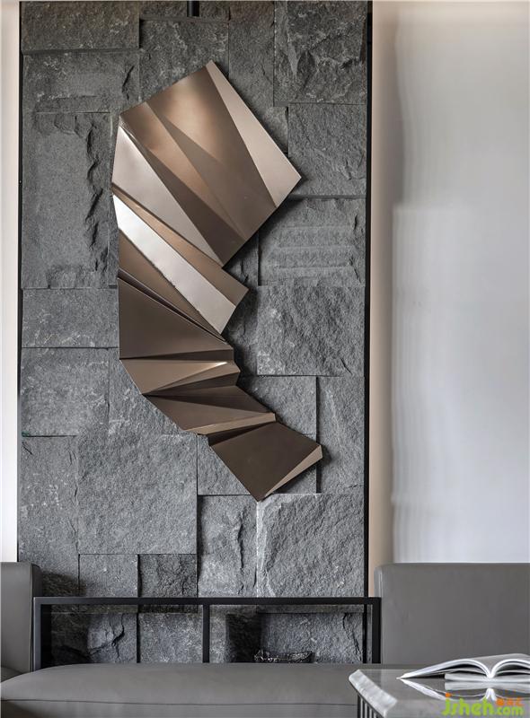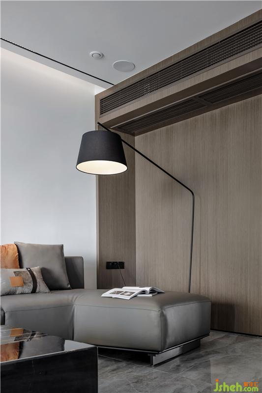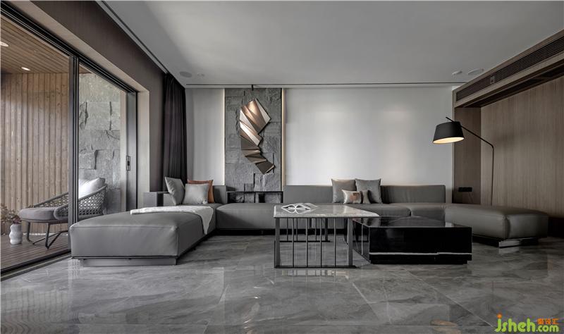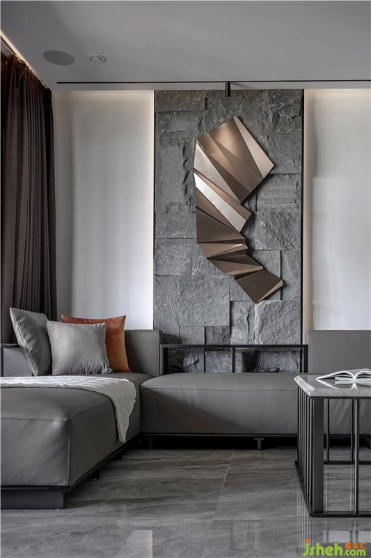 本案中,室內設計師采用灰色為主色調,沒有多余繁瑣的設計,而是利用開放式設計,利用簡單的線條,灰色調的大理石電視背景墻,地板為淺灰色的大理石瓷磚使空間一眼望去干凈利落,帶來視野的空闊感。在燈光方面利用藏燈而沒有繁瑣的吊燈,使得空間更加通透。室內設計師在軟裝方面搭配幾何設計,淡淡黃色的點綴,視覺效果強烈,使空間個性鮮明。