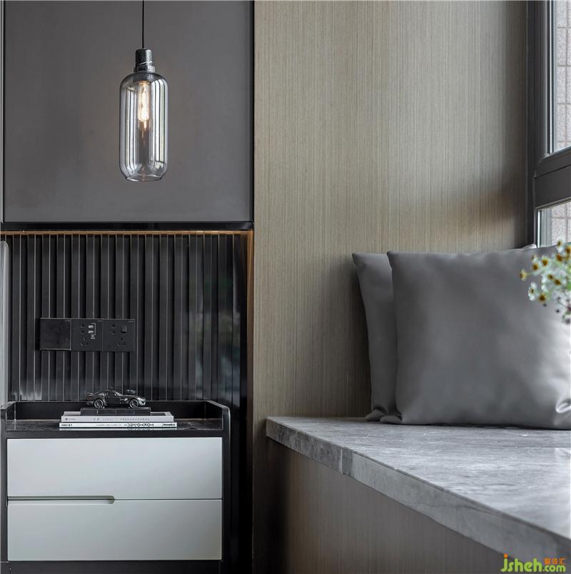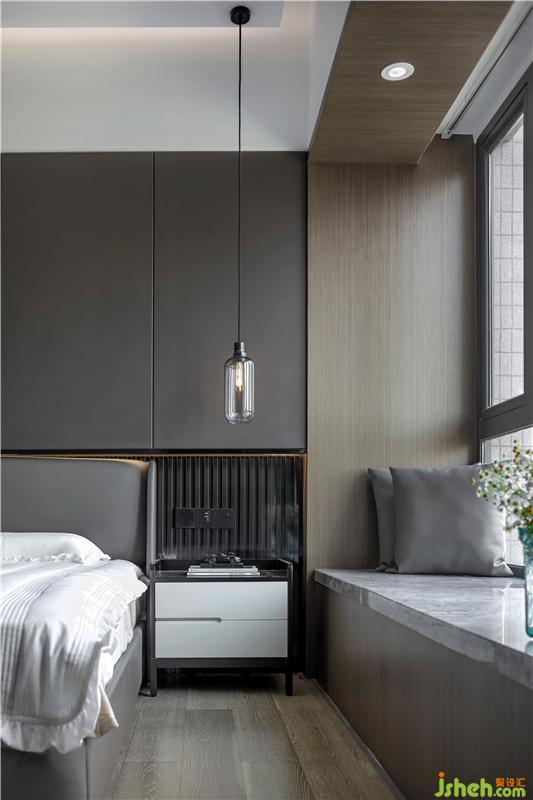 主臥給人一種“高大上”的簡(jiǎn)約美,色調(diào)為咖色調(diào)搭配高級(jí)的灰色,結(jié)合現(xiàn)代品質(zhì)的床品提升空間的高級(jí)感,開(kāi)闊的櫥窗使臥室采光充足;主臥床品使用咖色的抱枕、灰白色的麻制地毯和墻壁的布藝掛畫提升空間的藝術(shù)感,產(chǎn)生了空間與藝術(shù)的聯(lián)系。