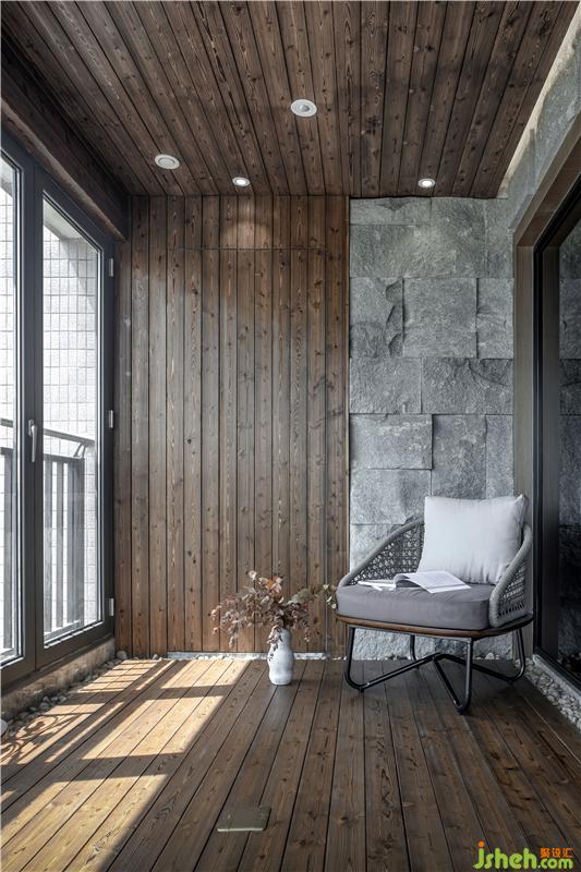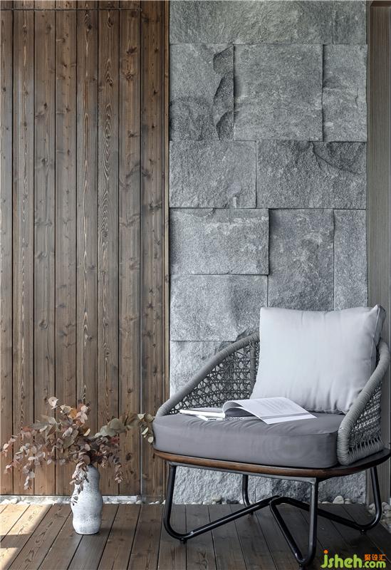 景觀陽(yáng)臺(tái)的原木地板,周圍鋪上鵝卵石,擺上白色的沙發(fā)椅,加上超大的落地窗設(shè)計(jì),采光很好,對(duì)窗外的世界一覽無(wú)遺,可以足不出戶體現(xiàn)花園的效果;墻壁的凹凸不平的石頭,室內(nèi)設(shè)計(jì)師用心的設(shè)計(jì)了掛壁式植物,讓身心近距離體驗(yàn)自然所帶來(lái)的舒悅,倍感身心放松。