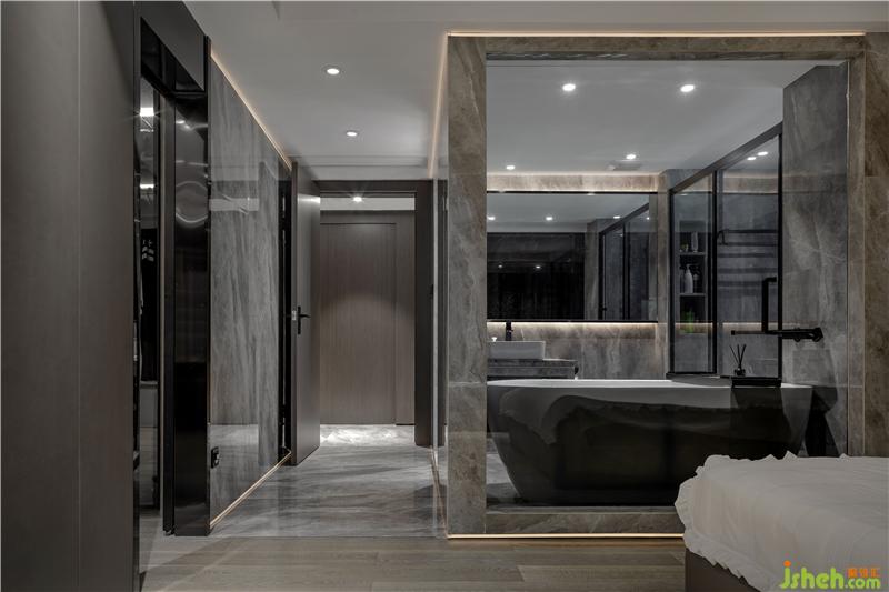 主衛(wèi)以灰色石材紋理的瓷磚打造,搭配白色衛(wèi)浴,干凈利落,極其純粹的色彩,使得空間充滿現(xiàn)代感。室內(nèi)設(shè)計(jì)師將整面落地玻璃與臥室分隔,使整個(gè)空間通透寬闊。白色的浴缸,明亮的光線照射下顯得身心無(wú)比放松,體現(xiàn)了戶主的生活狀態(tài),在勞累一天后,可以在這里盡情放松,享受完全屬于自己的時(shí)刻。