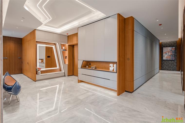 樣板房設(shè)計(jì)以空間的氣質(zhì)來(lái)揣度居者的品位,入戶玄關(guān)深色木與淺杏色飾面搭配相得益彰給空間帶來(lái)沉穩(wěn)的高貴氣息。幾何線條流線造型的換鞋區(qū)和天花造型上下呼應(yīng),結(jié)合明確的比例,優(yōu)美的線條和經(jīng)典的細(xì)節(jié),增加了空間的趣味性的同時(shí)也具有收納的實(shí)用性。