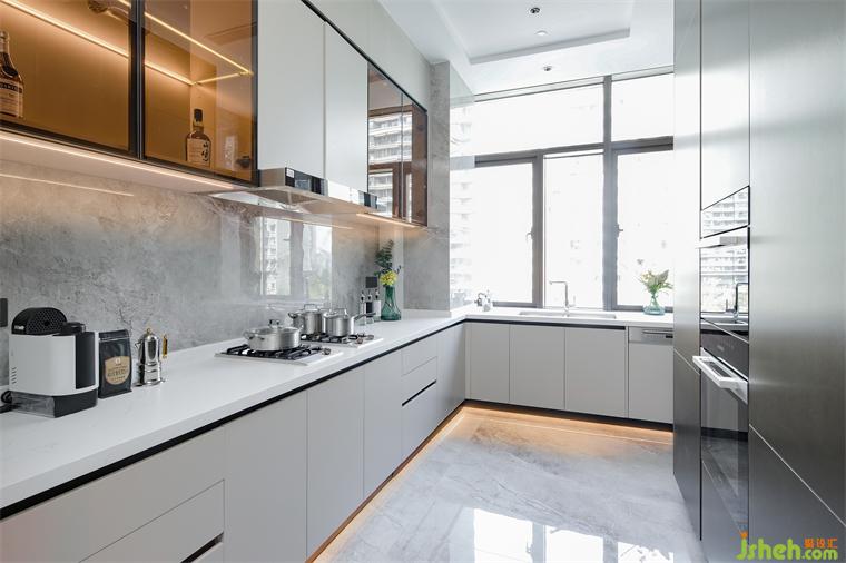 中廚配置了L型的廚柜既保證了操作面的同時(shí)也增加了很多收納功能。簡(jiǎn)練烤漆飾面為廚房帶來(lái)干凈利落質(zhì)感,暗藏內(nèi)嵌的設(shè)備,樣板房設(shè)計(jì)將功能與美觀完美結(jié)合,以心思布之各得其位,由器及道,感受著食材搭配之妙趣。這是對(duì)家的具象表達(dá),真實(shí)且幸福。