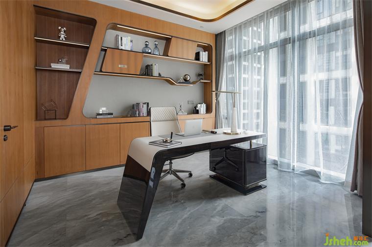 書(shū)房書(shū)柜不規(guī)則幾何元素增加一抹趣味性,即是書(shū)架也是展示柜,橫縱交錯(cuò)的線條和體塊,豐富空間功能屬性的同時(shí),賦予空間內(nèi)斂而溫潤(rùn)的優(yōu)雅氣質(zhì)。
