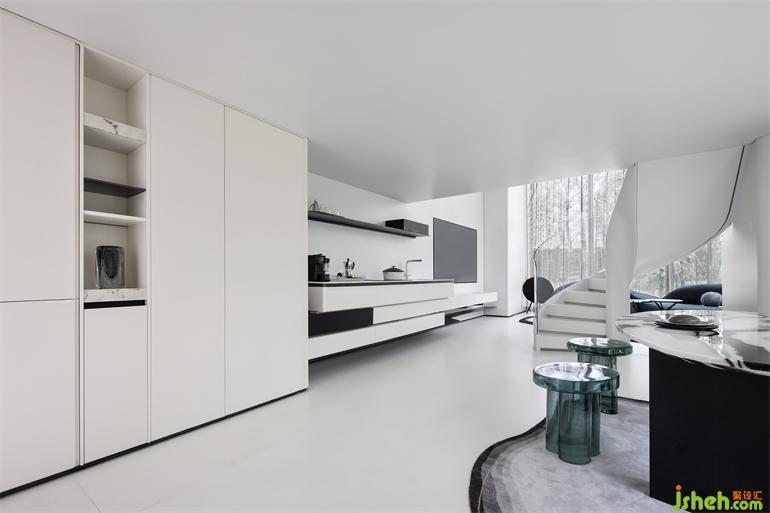 在該loft公寓裝修設(shè)計(jì)中,設(shè)計(jì)師思考的重點(diǎn)是:如何在繁華的都市中,尋找生活的留白,突破區(qū)域內(nèi)暮靄般沉郁的生活和工作節(jié)奏,為城市呈現(xiàn)一份清新美好。