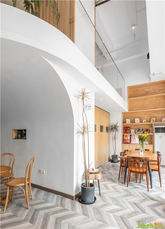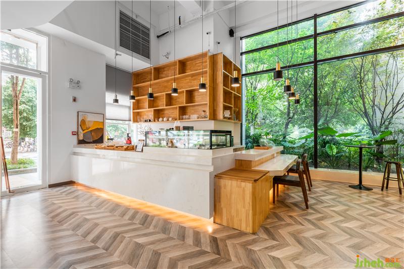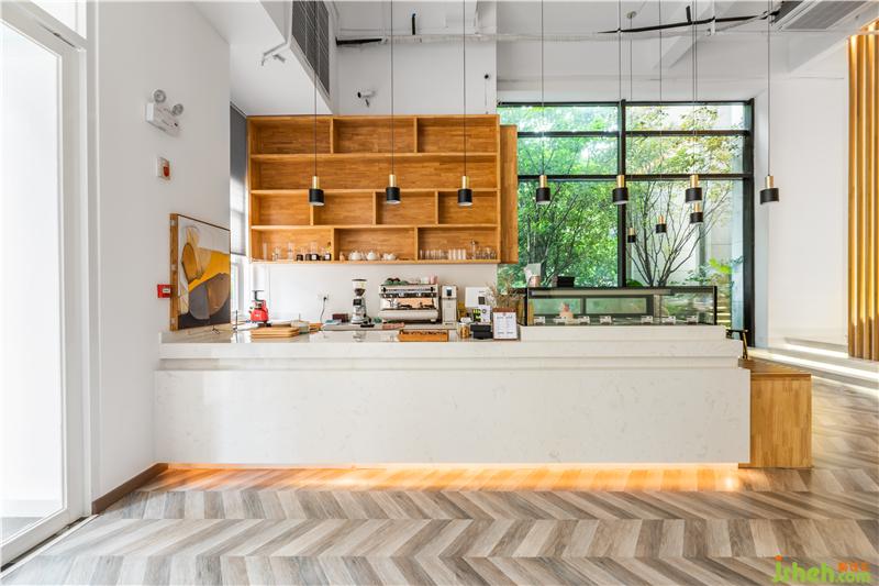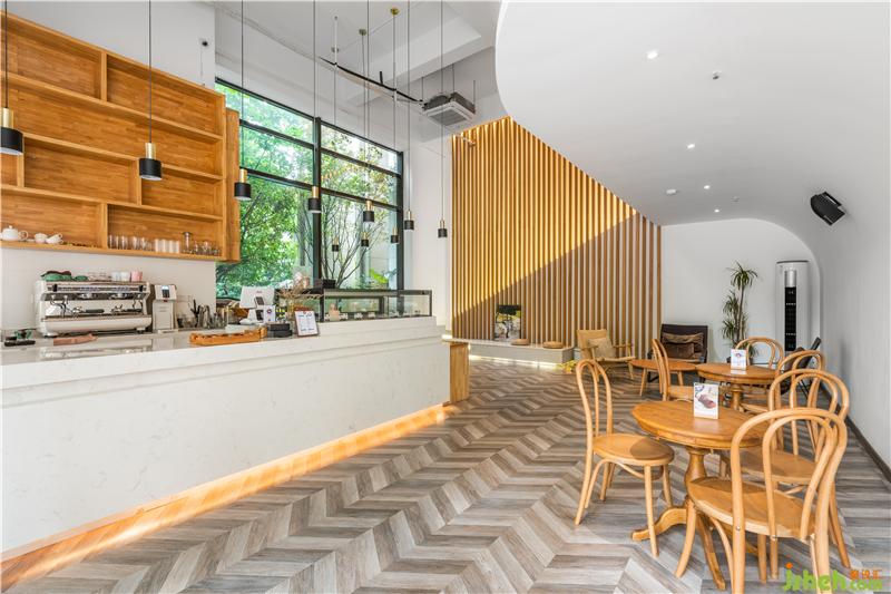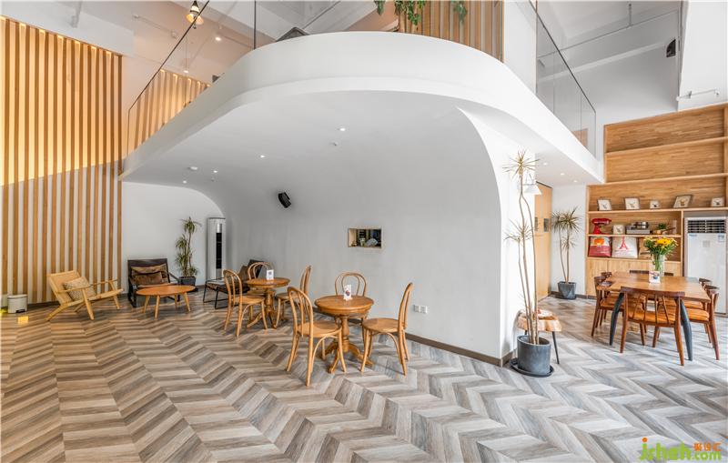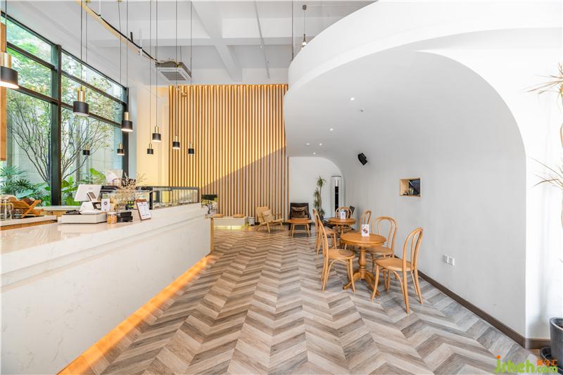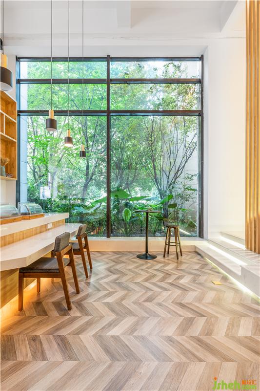 整個(gè)空間墻面、地板,用木材作為設(shè)計(jì)的主要材料,但地面選擇納入顏色斑駁的木質(zhì)幾何貼片,更具層次感和裝飾性。墻面選擇涂刷白墻為裝修設(shè)計(jì),吧臺(tái)臺(tái)面使用光潔的大理石,干凈敞亮。