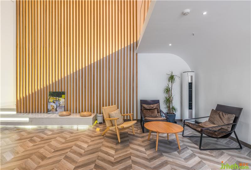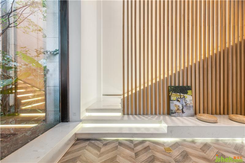 一樓通向二樓的樓梯安置在最內(nèi)側(cè)靠墻位子,不與其他功能互相干擾。同時(shí)用木質(zhì)豎條格柵進(jìn)行遮擋,既增加了裝飾效果,又使空間整體性更嚴(yán)密。階梯嵌入燈帶,人行在上面行走時(shí),明與暗、動(dòng)與靜幾何分割層次感更加強(qiáng)烈。