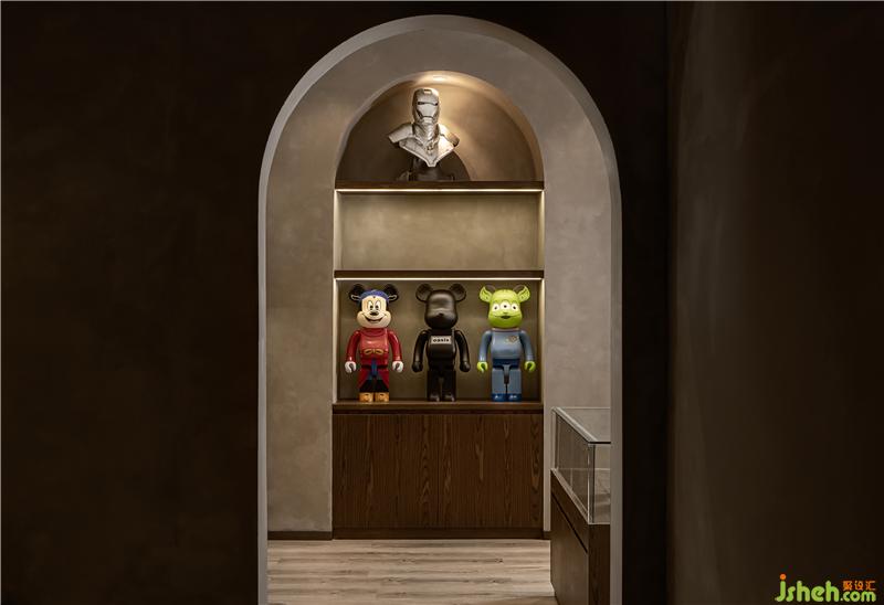 為出離傳統(tǒng)經(jīng)營環(huán)境,用設(shè)計(jì)手法傳達(dá)“圓融”觀念。一來設(shè)置循環(huán)動(dòng)線環(huán)抱前臺(tái),寓意為流水源源不絕,財(cái)源廣進(jìn)。二來前方留出較為寬敞的行走空間,暗示可咸可甜的社交距離。整個(gè)購物過程親和愉悅,避免了過度商業(yè)化痕跡。
