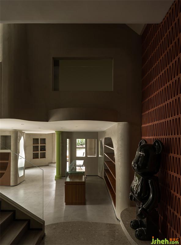店鋪設(shè)計(jì)在滿足了功能具備的情況下,儲(chǔ)藏室的入口被隱藏在門廊的最深處,層疊交匯的拱門造型里鋪滿了鏡面,造就了拉伸縱深空間的穿越感,跟紅磚造型墻形成強(qiáng)烈的時(shí)空對(duì)話、虛實(shí)互補(bǔ),仿佛在把多維世界的訊息傳達(dá)給人們,追隨流動(dòng)的影蹤蕩滌至遠(yuǎn)端。在不斷變化的光線的幫助下塑造了一個(gè)全新的世界??臻g中星羅棋布散落著淺金色的光暈,仿佛時(shí)間還在流逝,剎那間又停下,那一幀亦真亦幻。