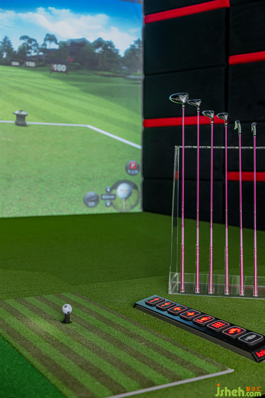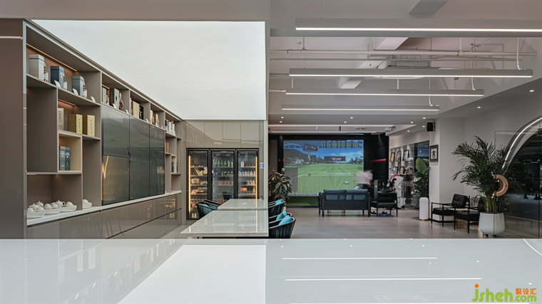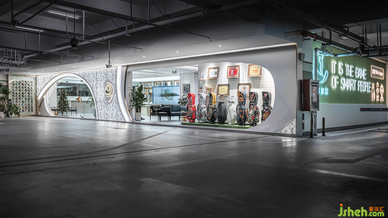 深圳旗艦店設計空間的元素用的極少,白色的直面墻體,有質(zhì)感的水泥灰磚,細膩的曲面燈膜造型的轉(zhuǎn)折,每一個變化都融匯在空間中,讓觀者感受到設計的用心,曲線的流線走向?qū)⑹彝饩坝^和室內(nèi)感受和諧為一體。弧形天花吊頂、不規(guī)則的水吧臺增加了公共空間的柔和度和趣味性,而直線線條和LED燈條的嵌入為整個空間增添了動態(tài)和現(xiàn)代感。暗藏式的洗墻照明系統(tǒng)、裝飾性景觀元素和設計得像高爾夫球上的各式各樣的圓點的紋理鋁板門頭,強烈地刻畫了俱樂部的舒適氛圍。大理石材質(zhì)的運用,提升了俱樂部的質(zhì)感,并用于標記一些非常特殊的區(qū)域,如懸浮的水吧臺。有色玻璃和透明玻璃的交錯使用,增強了公共與私密空間的對話,創(chuàng)造了一個有趣的視角。玻璃的冷峻、天地一色柔軟的墻體肌理與因豎向帷幔的遮擋而隱約透出的“光墻”,構(gòu)成細微的、巧妙的表情對比。
