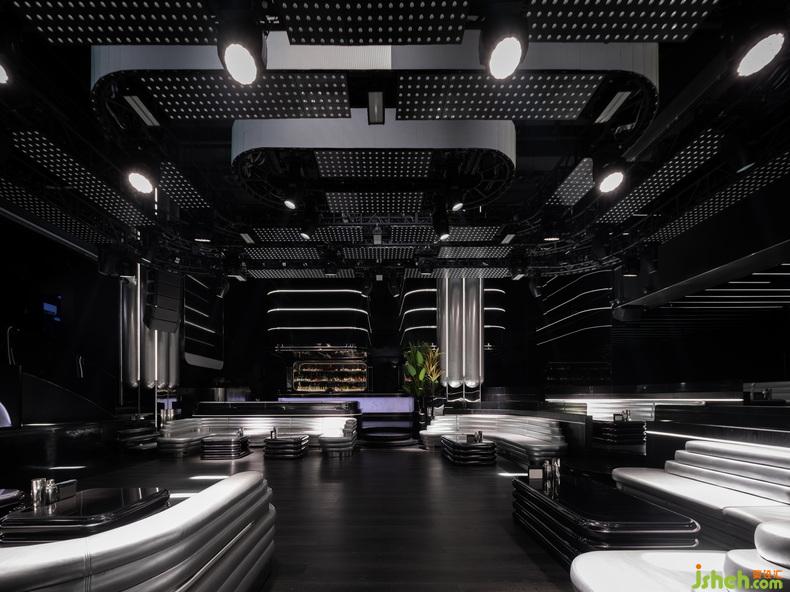 石材、鏡面、烤漆、不銹鋼、皮質(zhì)等材料組合為鮮明的視覺傳達,主色中卻有有著近百種不同層次的“黑”。夜店設(shè)計形態(tài)簡潔而抽象的有機曲線,亦打破橫平豎直的構(gòu)圖并重新釋義經(jīng)典美學(xué)。