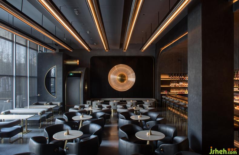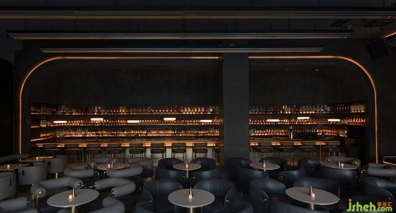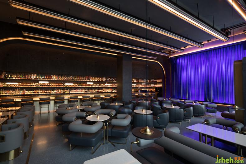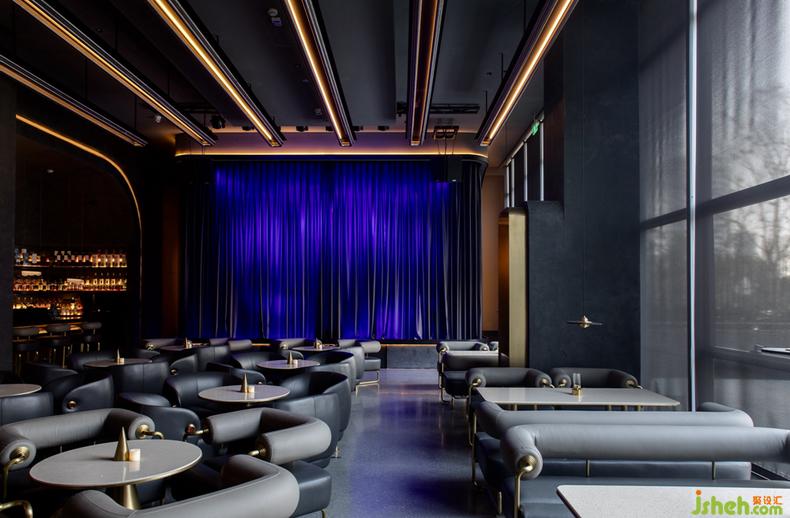 酒吧設(shè)計按鈕移開電動門進入酒吧主體,臥于吊頂上的金屬軌道燈,引導(dǎo)視線.一幕深邃的藍色幕布如果凍般凝固在舞臺上.