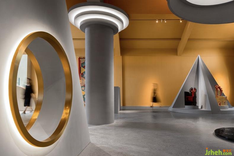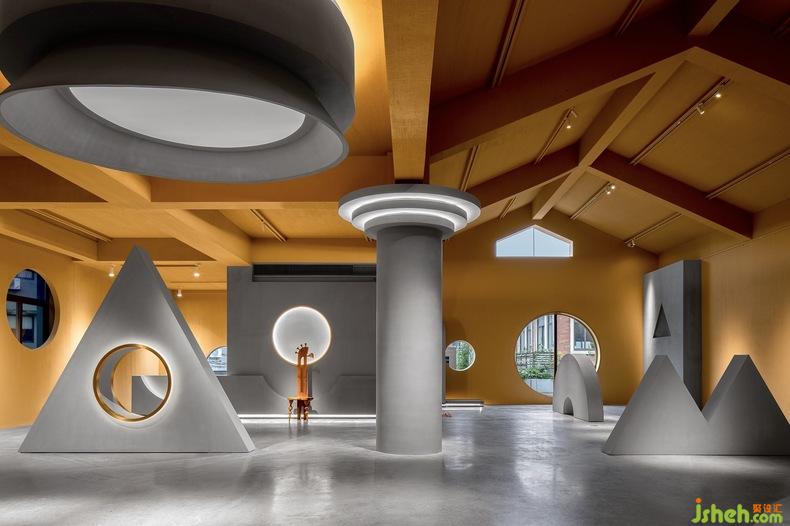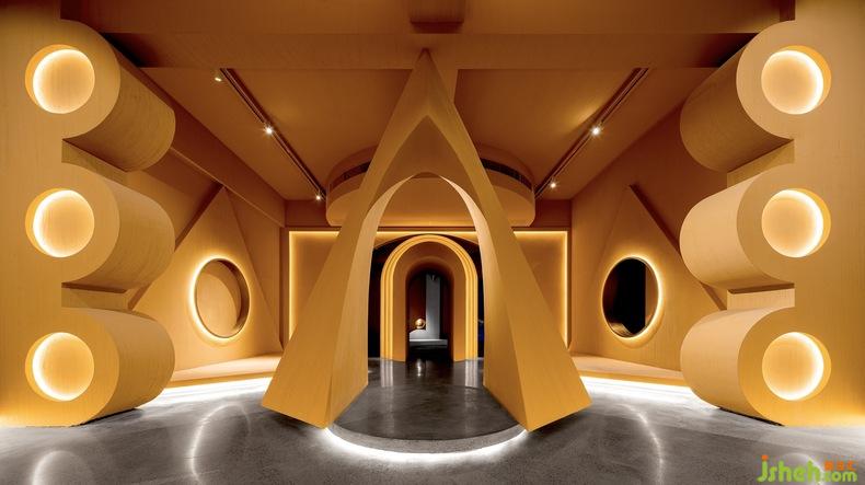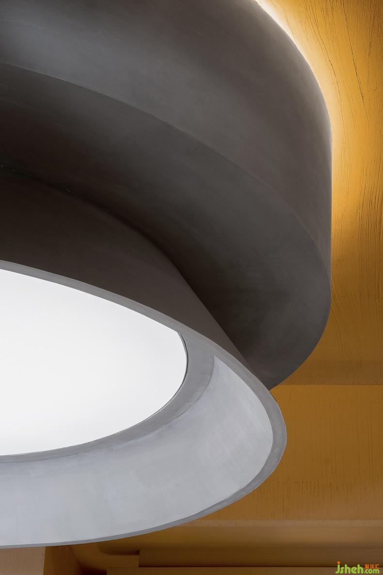 空間被各種形體堆疊后形成無(wú)數(shù)個(gè)觀看的視點(diǎn),所有造型自身是觀看點(diǎn),同時(shí)又是幾何切割的取景框。環(huán)狀的吊頂燈箱營(yíng)造猶如天光從上空漫溢下來(lái)的感受,燈體隨著光線往外擴(kuò)散,隱約制造天外來(lái)物般的懸浮感。