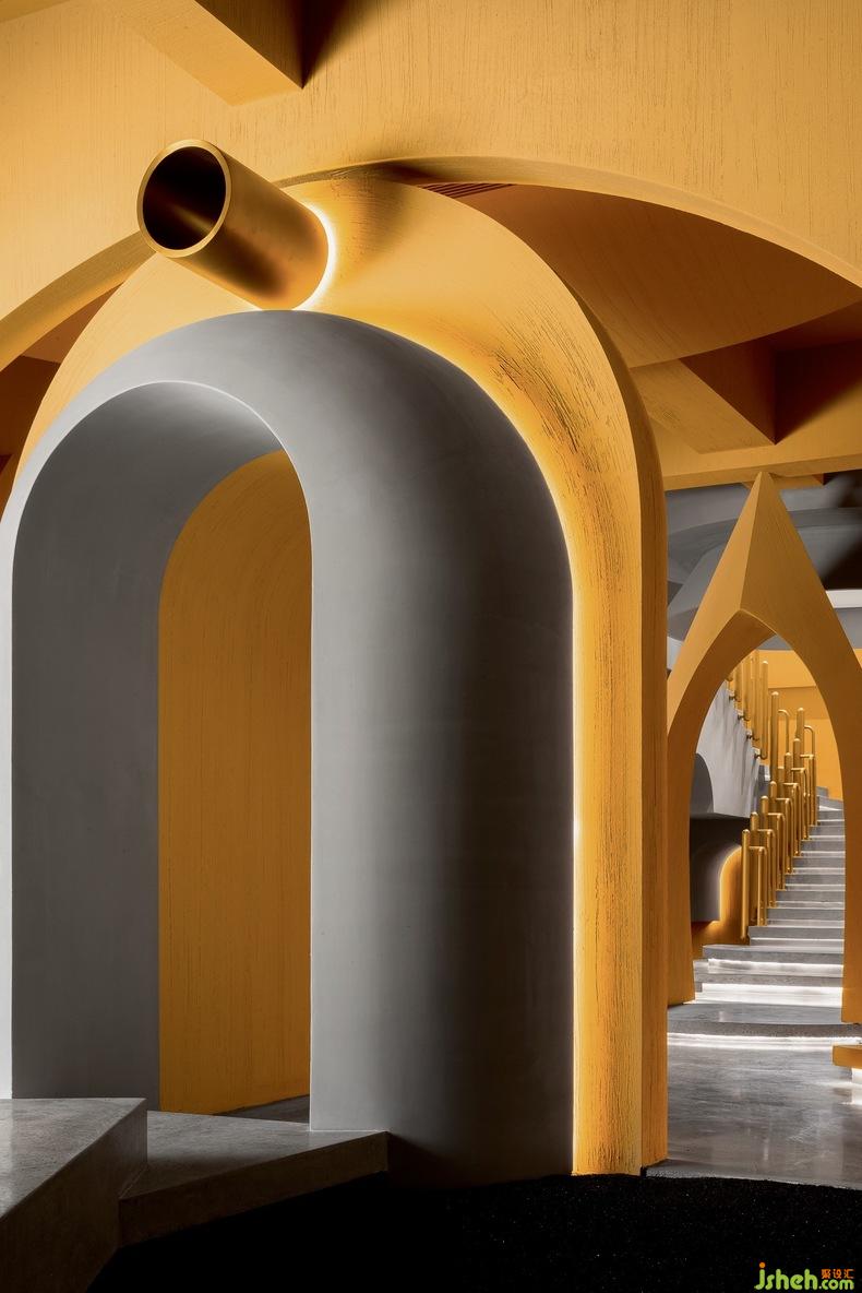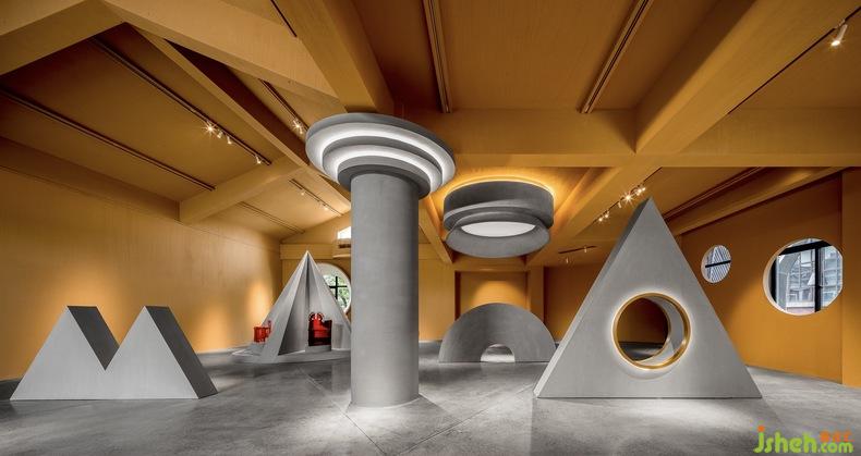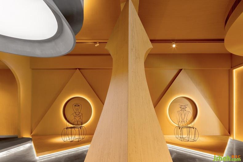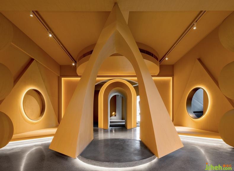 二層空間作為完全的展廳,立面造型是可移動(dòng)的幾何體屏風(fēng)。延續(xù)取景框的概念,文化設(shè)計(jì)讓觀察、欣賞的視角發(fā)生轉(zhuǎn)變,全景或局部、踮腳或俯身,空間中的小趣味透過(guò)簡(jiǎn)單卻精巧的布局生成。同時(shí)它們與地面的材質(zhì)一致,因而二者的關(guān)聯(lián)度更大,結(jié)構(gòu)好似向上生長(zhǎng)蔓延的生命體。