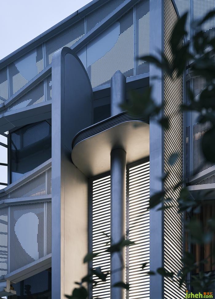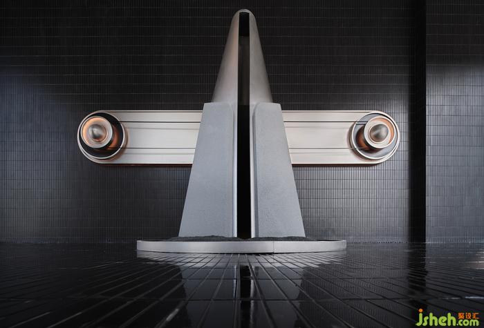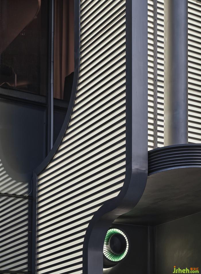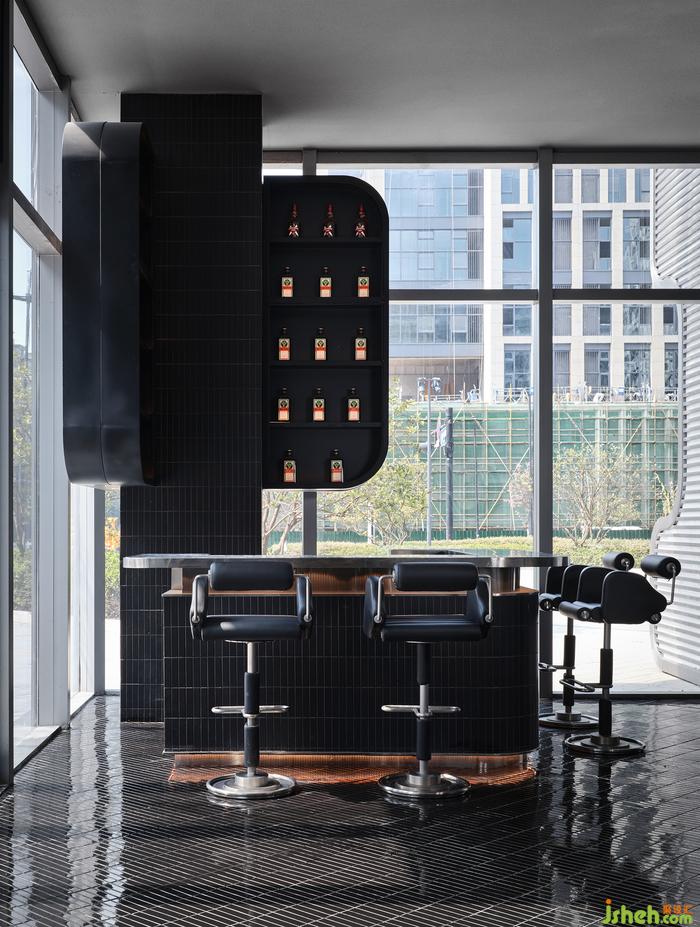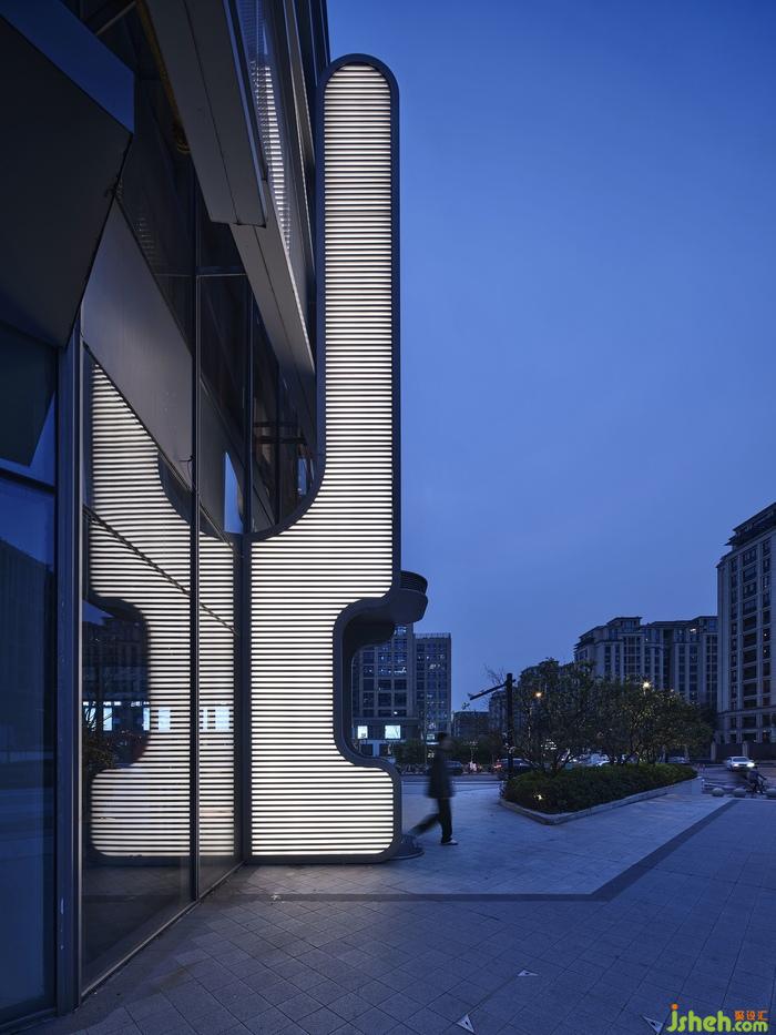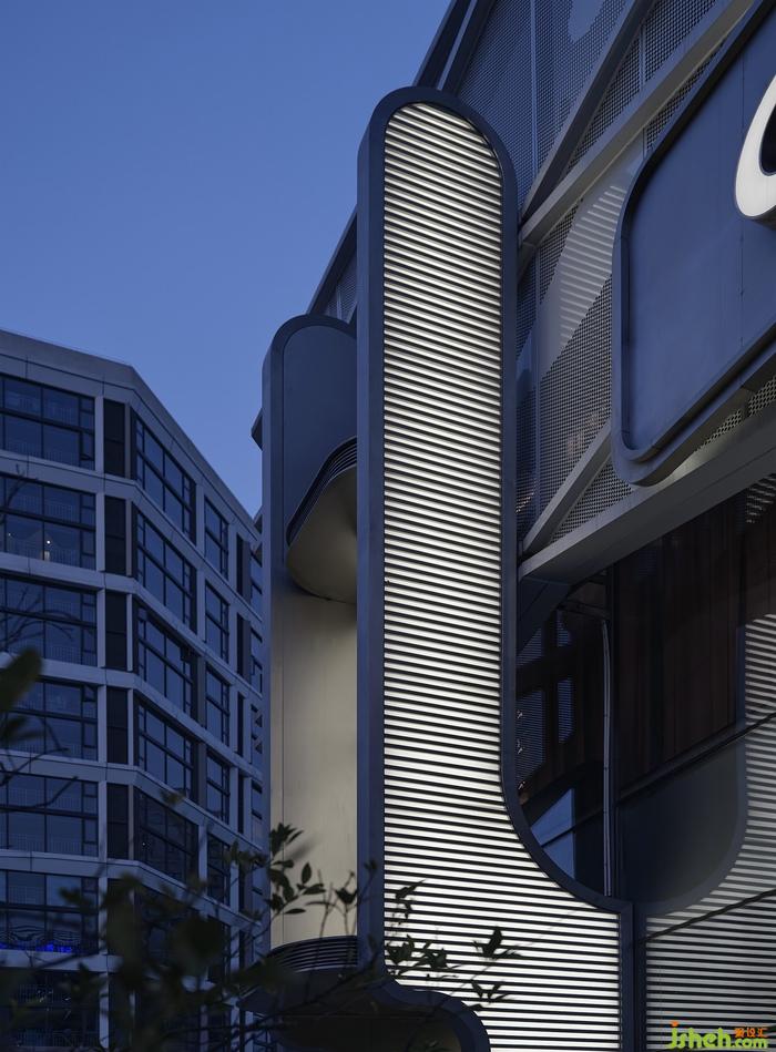 凹凸有致的外立面及入口造型別具一格,燈光與水平條紋線條的穿插結(jié)合,既回應(yīng)了所在建筑的鋼網(wǎng)格圍合結(jié)構(gòu),巨型雕塑般的藝術(shù)形態(tài)又仿若開啟時(shí)光的“切口”。輔以鏡面對(duì)稱相組的視覺效果,在夜幕漫下時(shí)迷幻感也悄然而現(xiàn)。