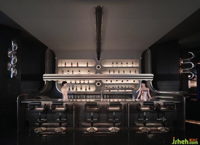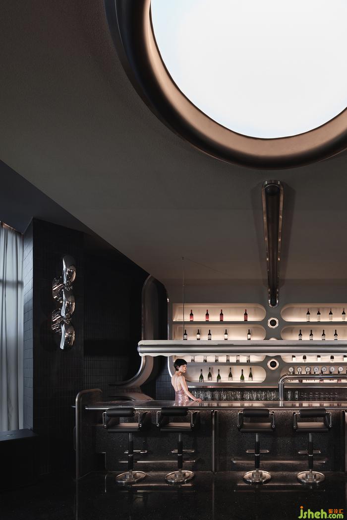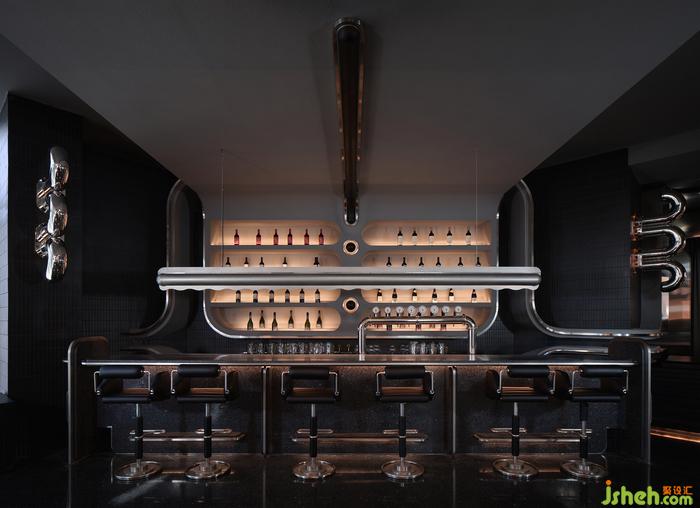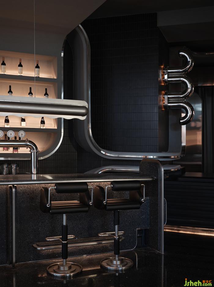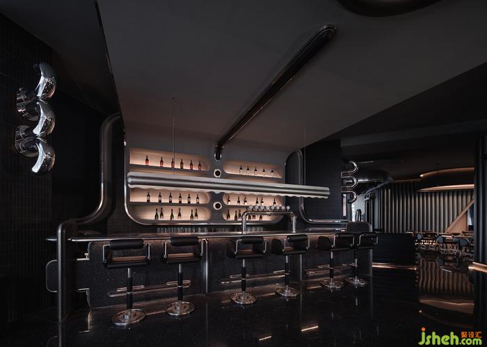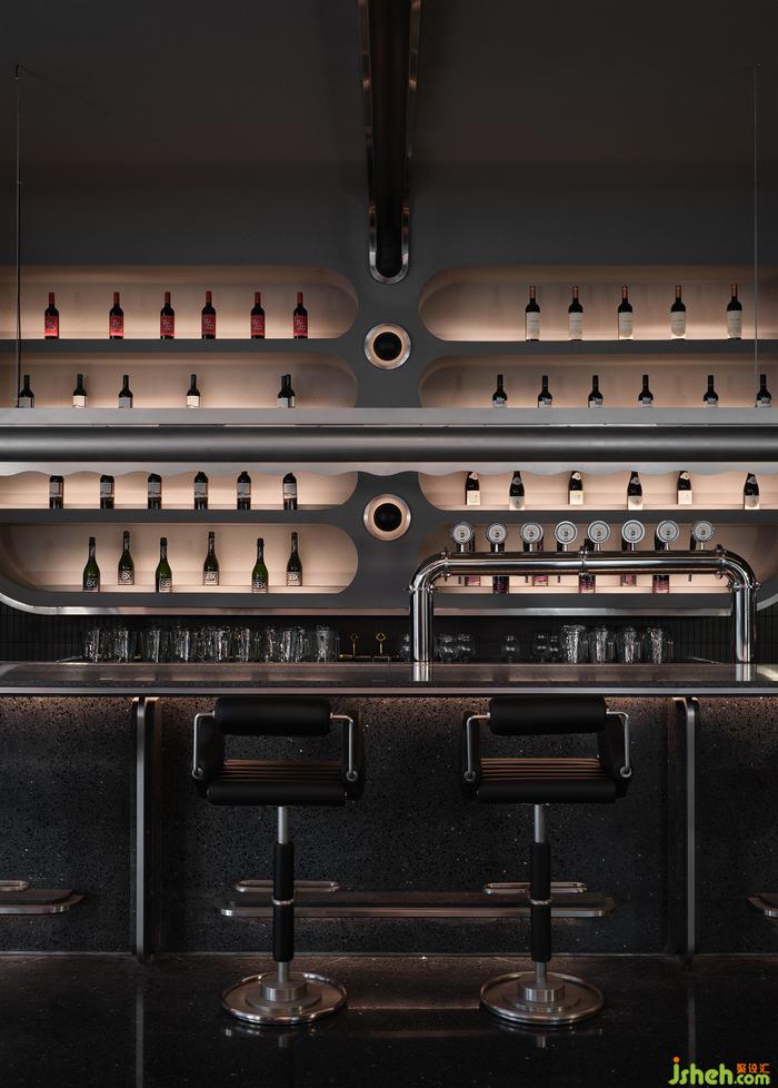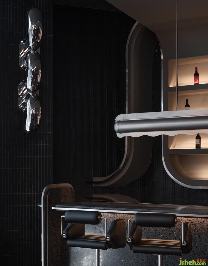 空間中的石材、金屬、皮質(zhì)、海綿、音樂、幕布,經(jīng)由設(shè)計(jì)在不改變物質(zhì)形態(tài)的基礎(chǔ)上,餐廳設(shè)計(jì)重新組合其線、面、體積、重量、紋理,而形成被鉆石般精密計(jì)算、切割打磨、晶瑩無(wú)暇的一個(gè)整體場(chǎng)景。幾何與有機(jī)構(gòu)圖交相疊映,不同光澤度中和色系上的沉悶,恰到好處地劃落視覺重點(diǎn)。