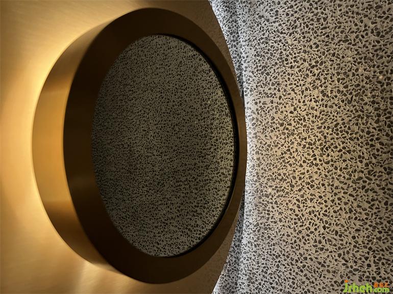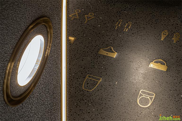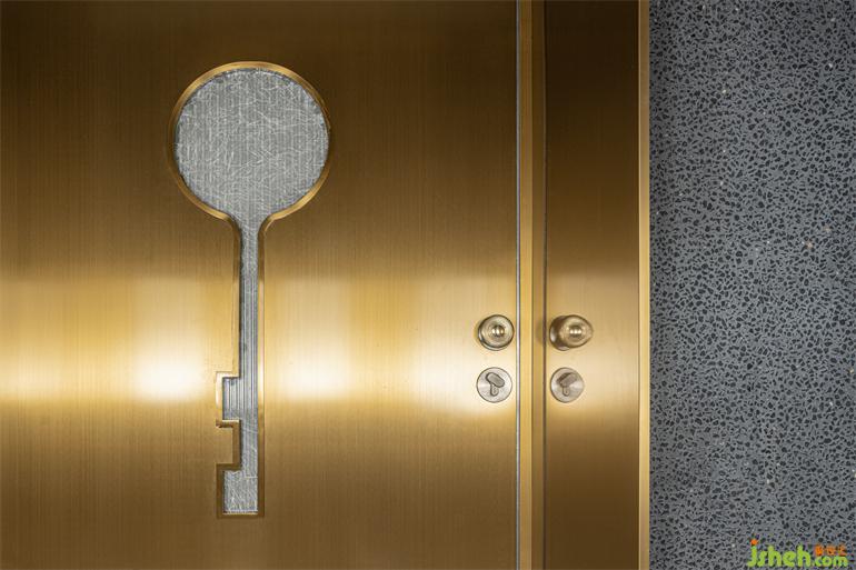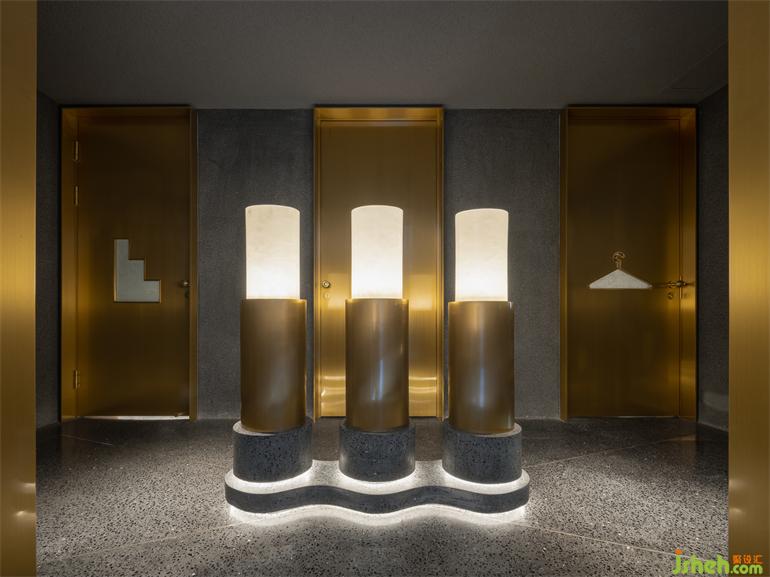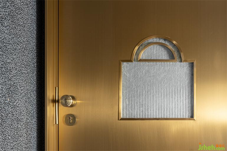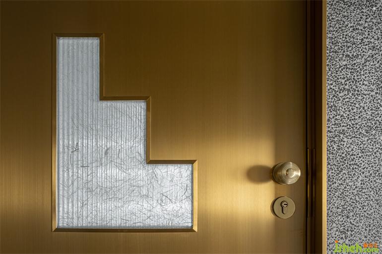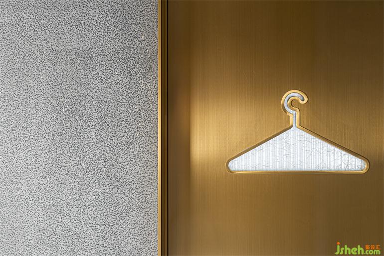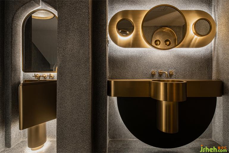 洗?間位于?層和?層之間的夾層空間,形式語?是主體空間的統(tǒng)?和延續(xù),裝修設(shè)計(jì)在幽深圍合的背景中,以光澤度?的?屬和鏡?材質(zhì)搭配間接照明的渲染,引導(dǎo)視覺的秩序和知覺的連續(xù),營造出充滿溫暖內(nèi)涵與抽象線條的?何美感。洗?臺鏡?道具和鏡中影像恰好組合成?只可愛的“卡通?豬”,或許是PIG Design隨機(jī)埋藏的令?會??笑的彩蛋。