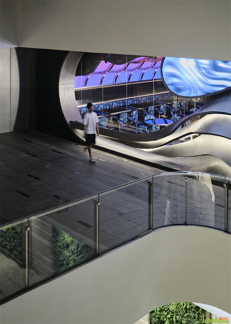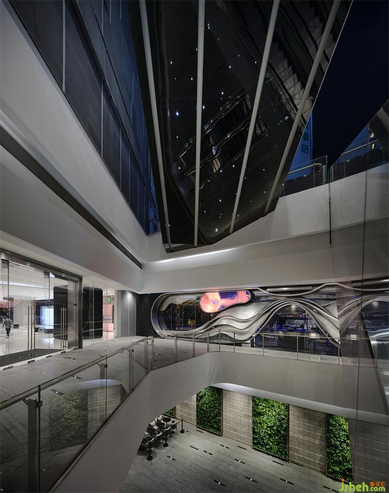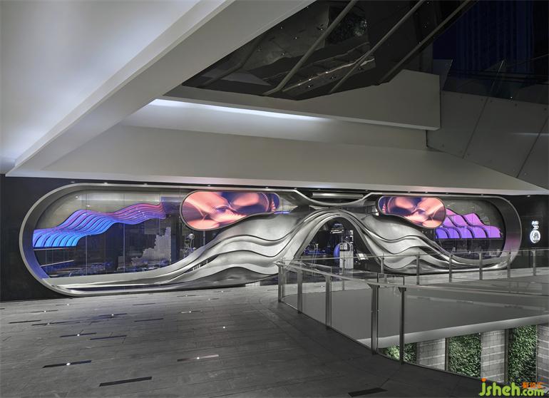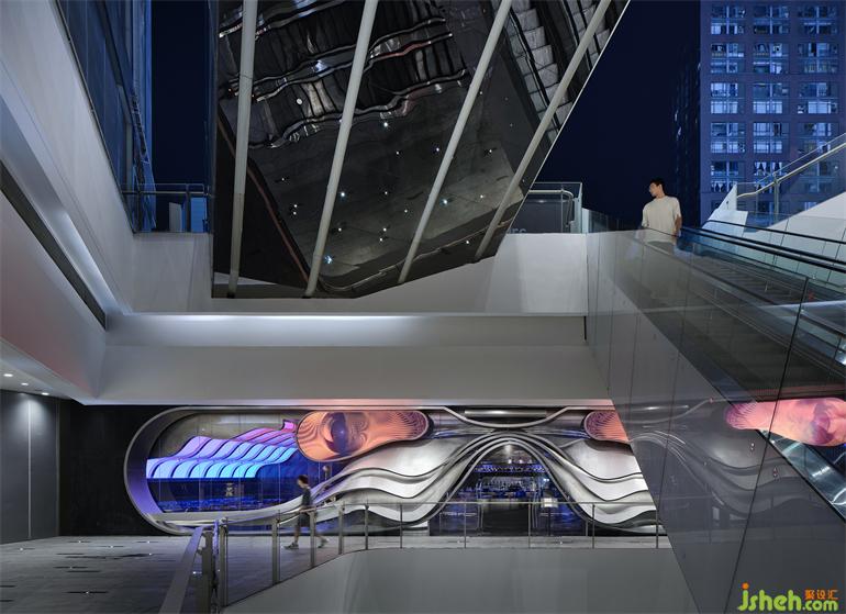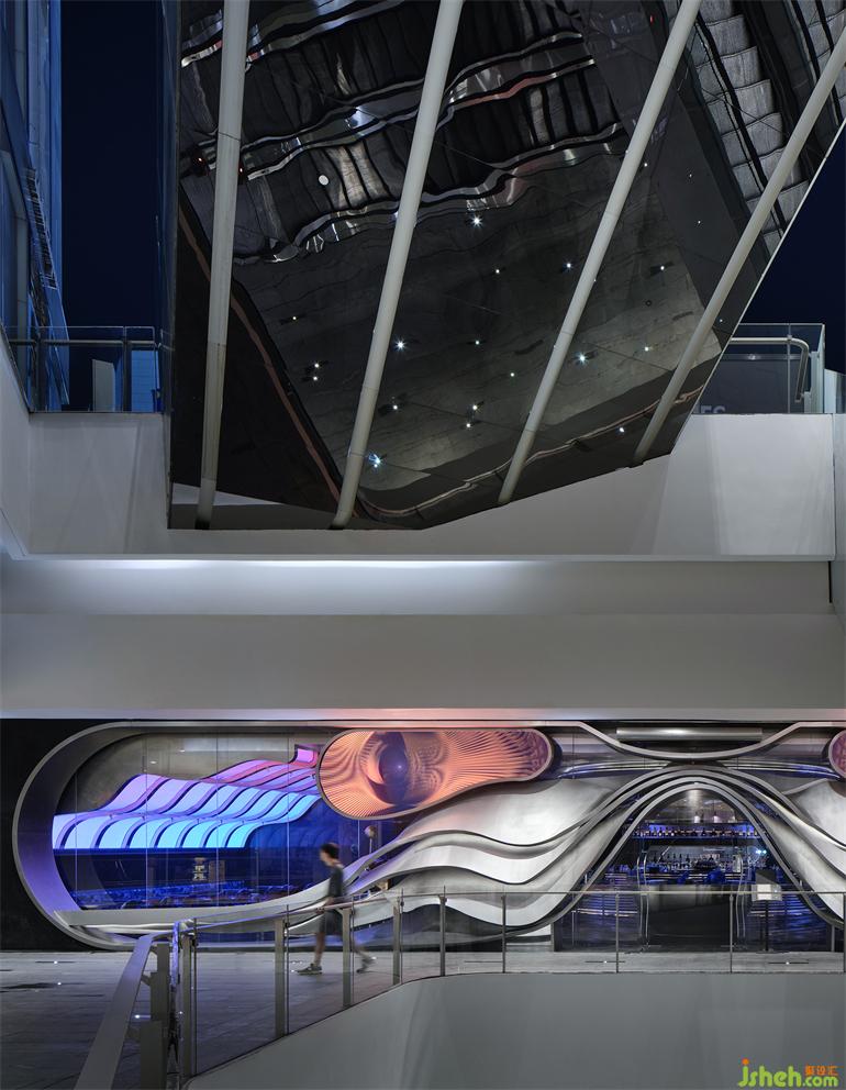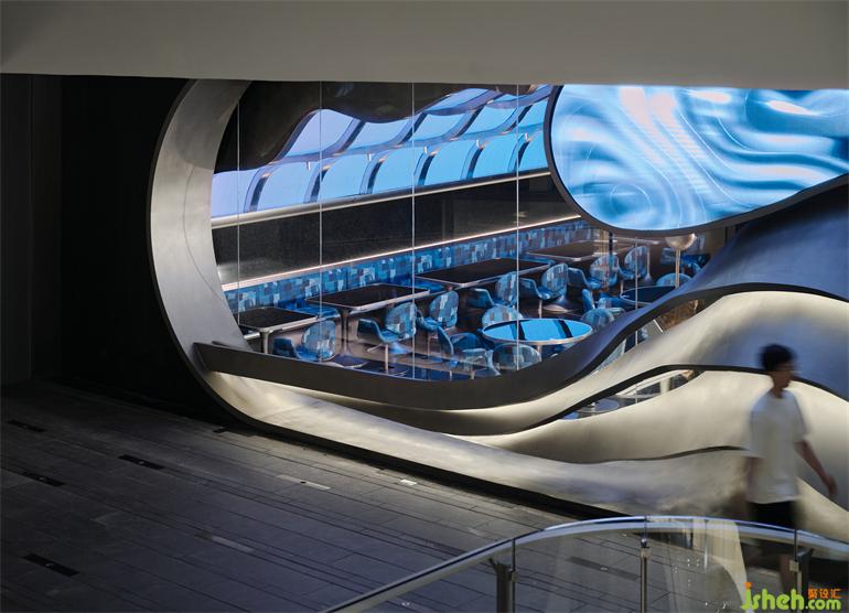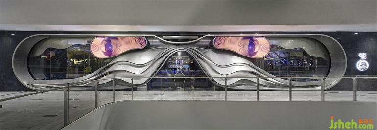 項(xiàng)目位于成都春熙路商圈的時(shí)尚地標(biāo)IFS國際金融中心負(fù)一層,隱匿在聯(lián)通著地鐵站和露天廣場的扶手電梯側(cè)面。門頭是對場地原有玻璃立面的外加設(shè)計(jì),橫跨25米長的有機(jī)曲面結(jié)構(gòu)以不銹鋼手工鍛造而成,成都居酒屋設(shè)計(jì)與嵌入的LED電子屏組合為一副超大型的“墨鏡”,在虛擬與現(xiàn)實(shí)的切換中旁觀并捕捉都市物質(zhì)文明的流動意涵。
